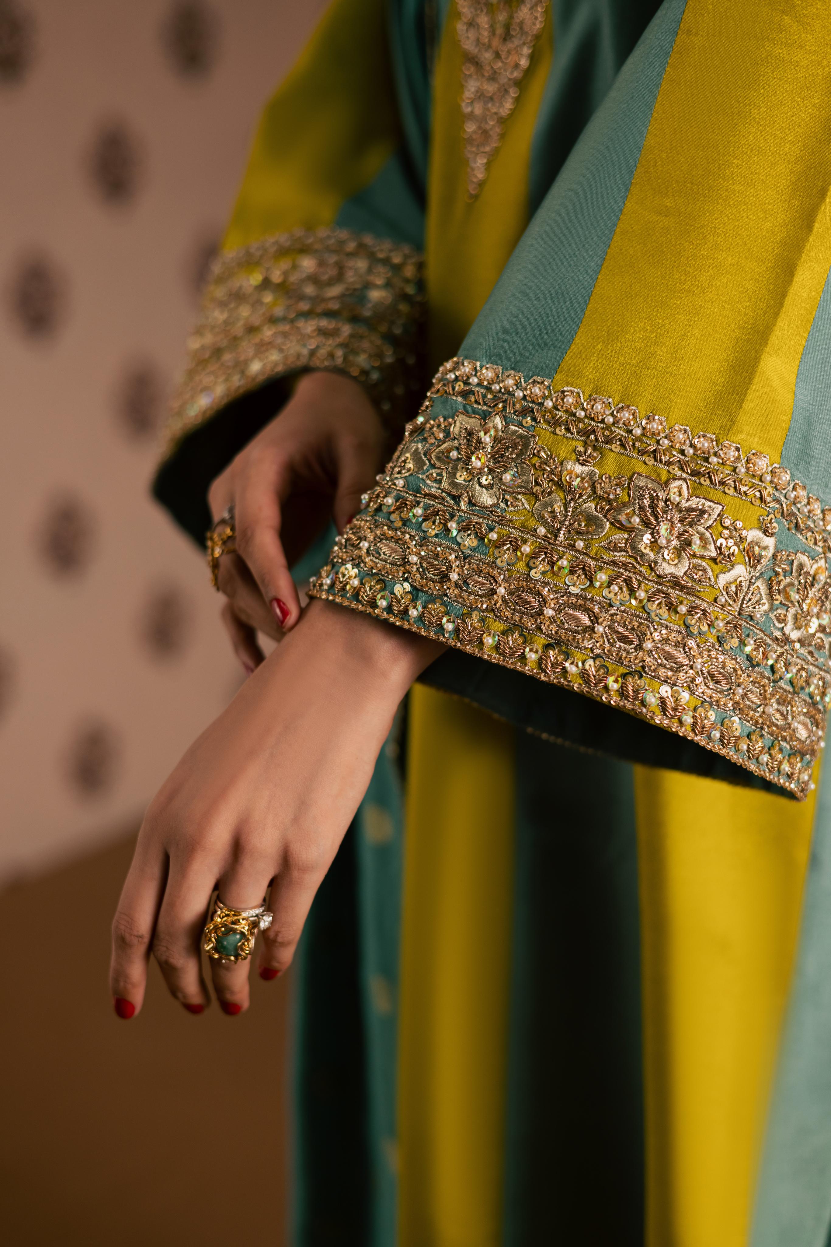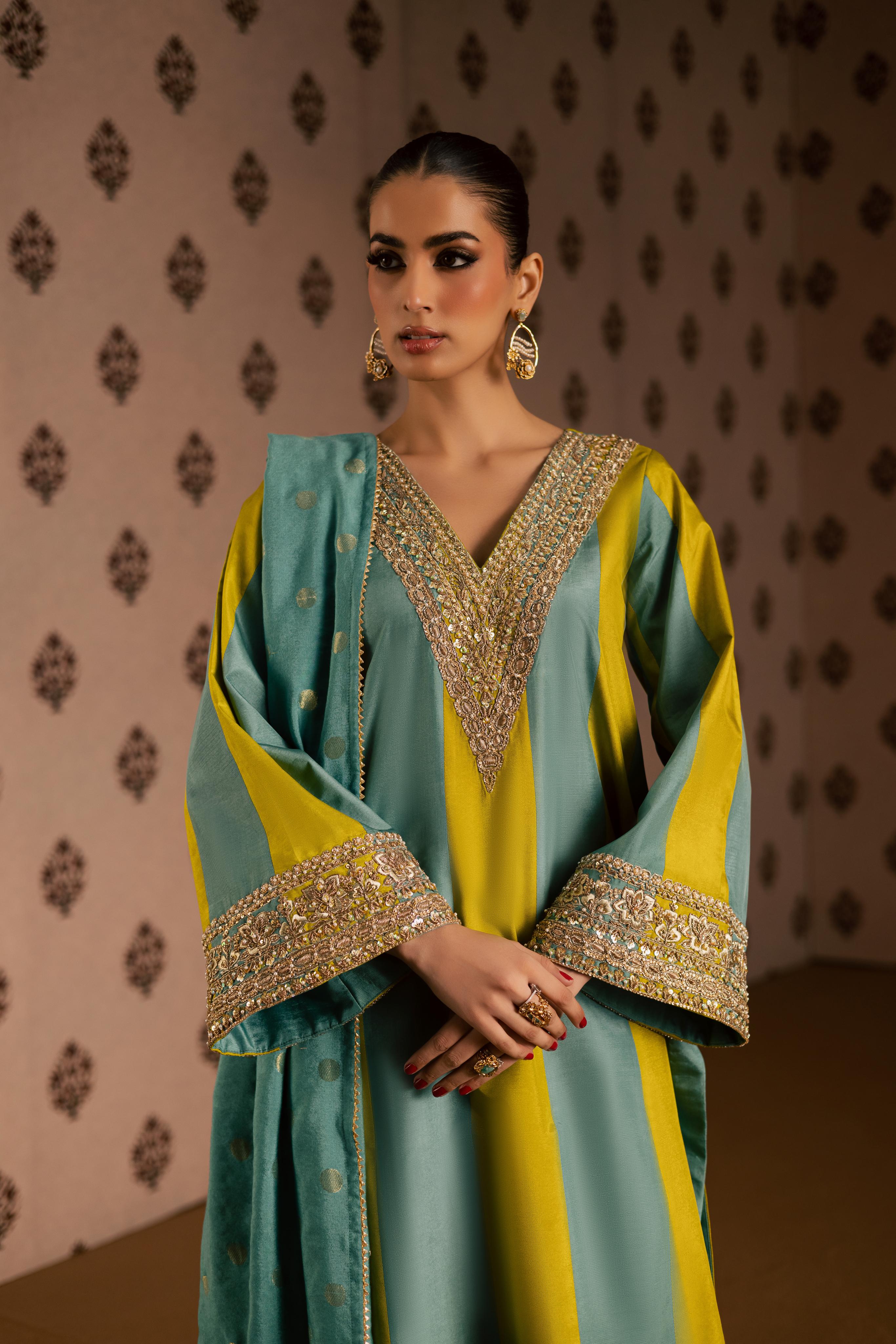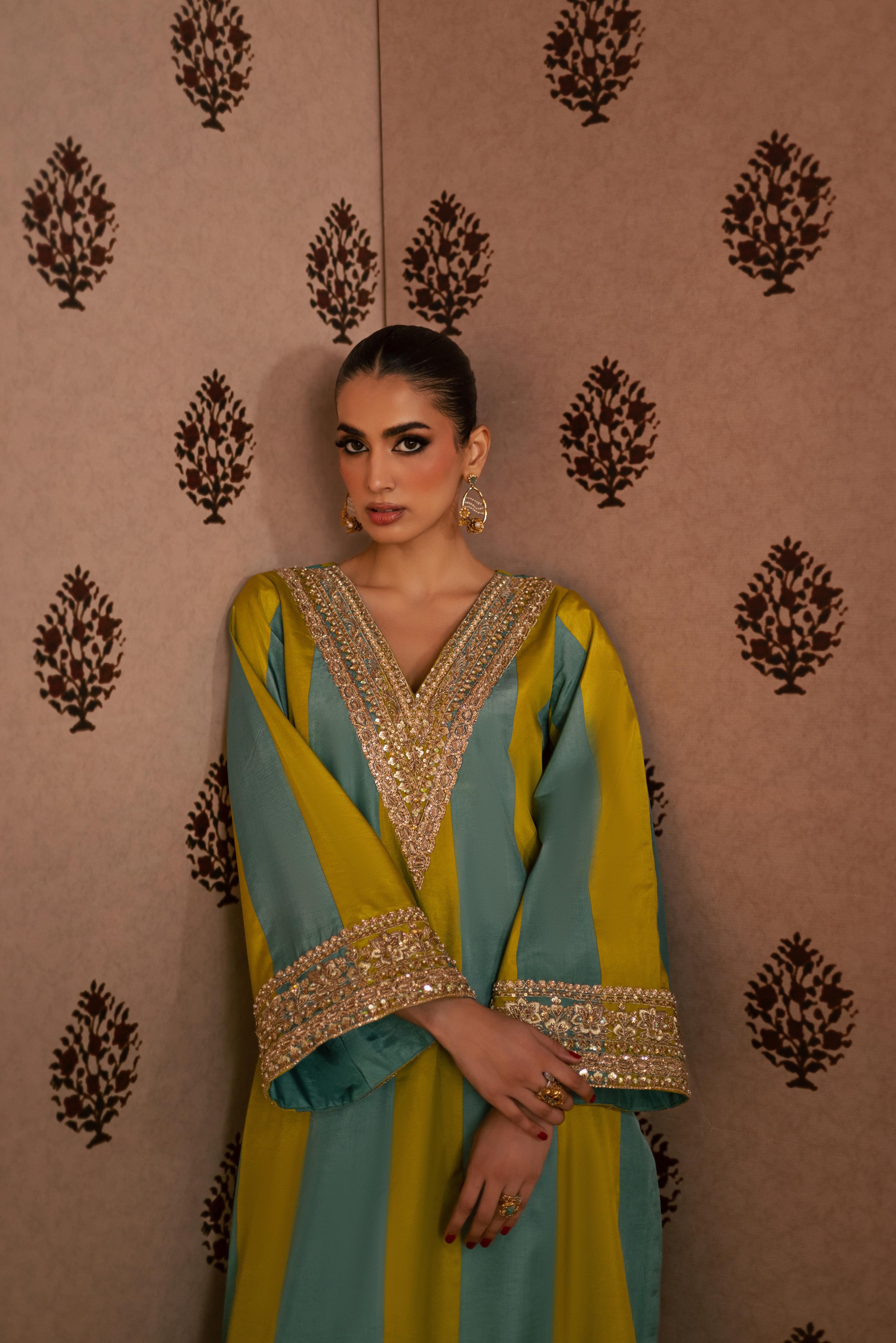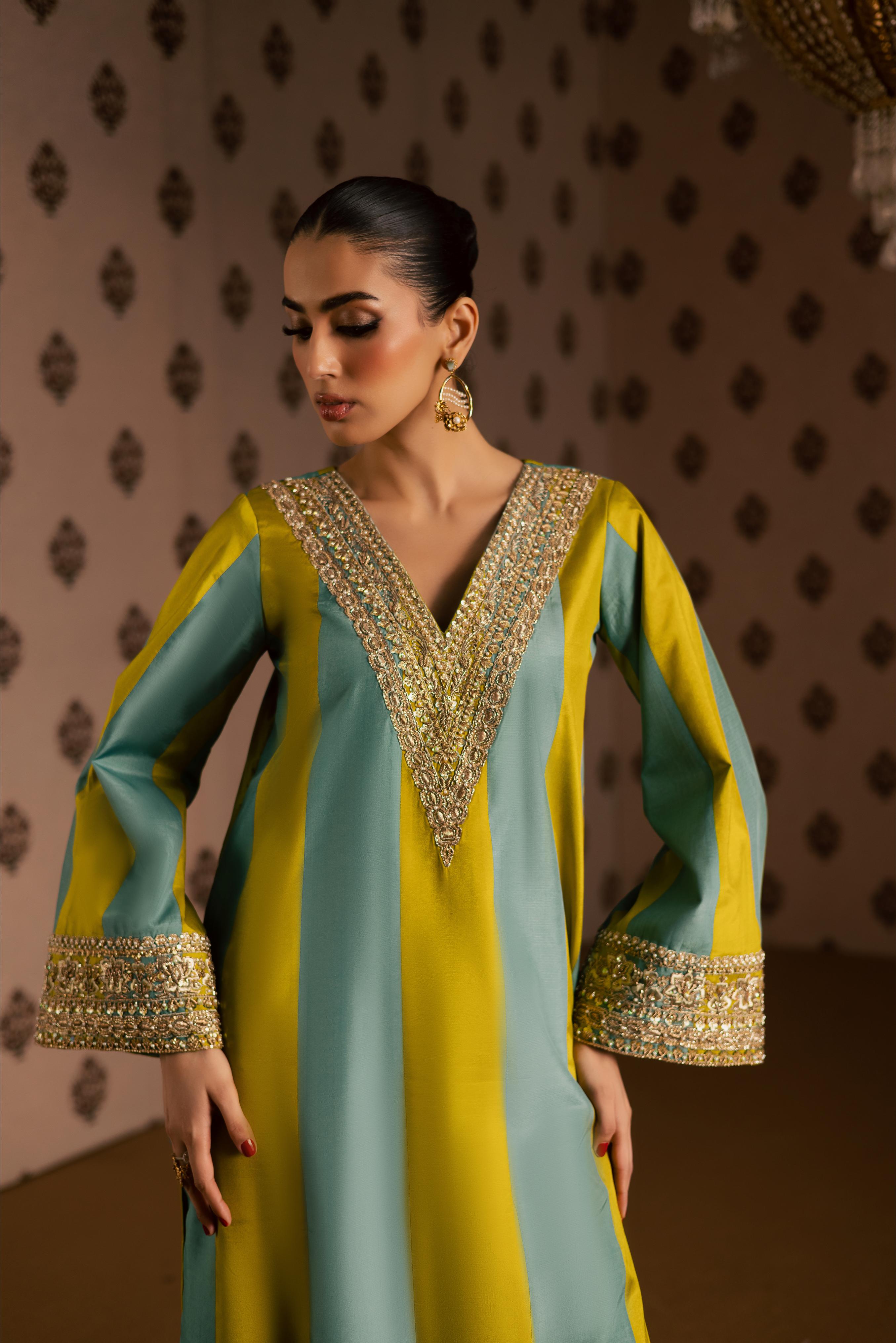 A two-tone pure sheesha silk A-line shirt with an embellished neckline and sleeves, paired with straight pants and a gajji... Read more