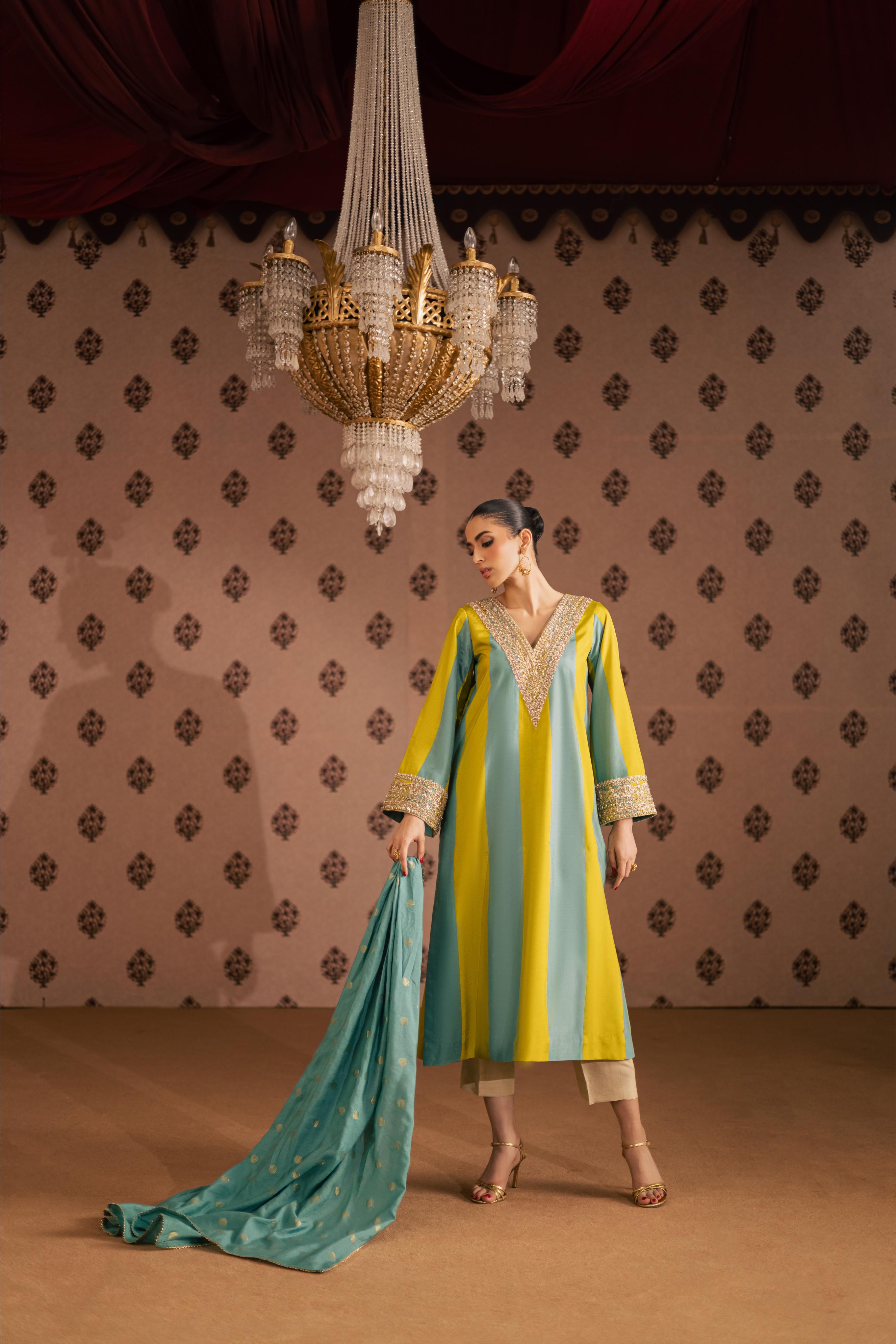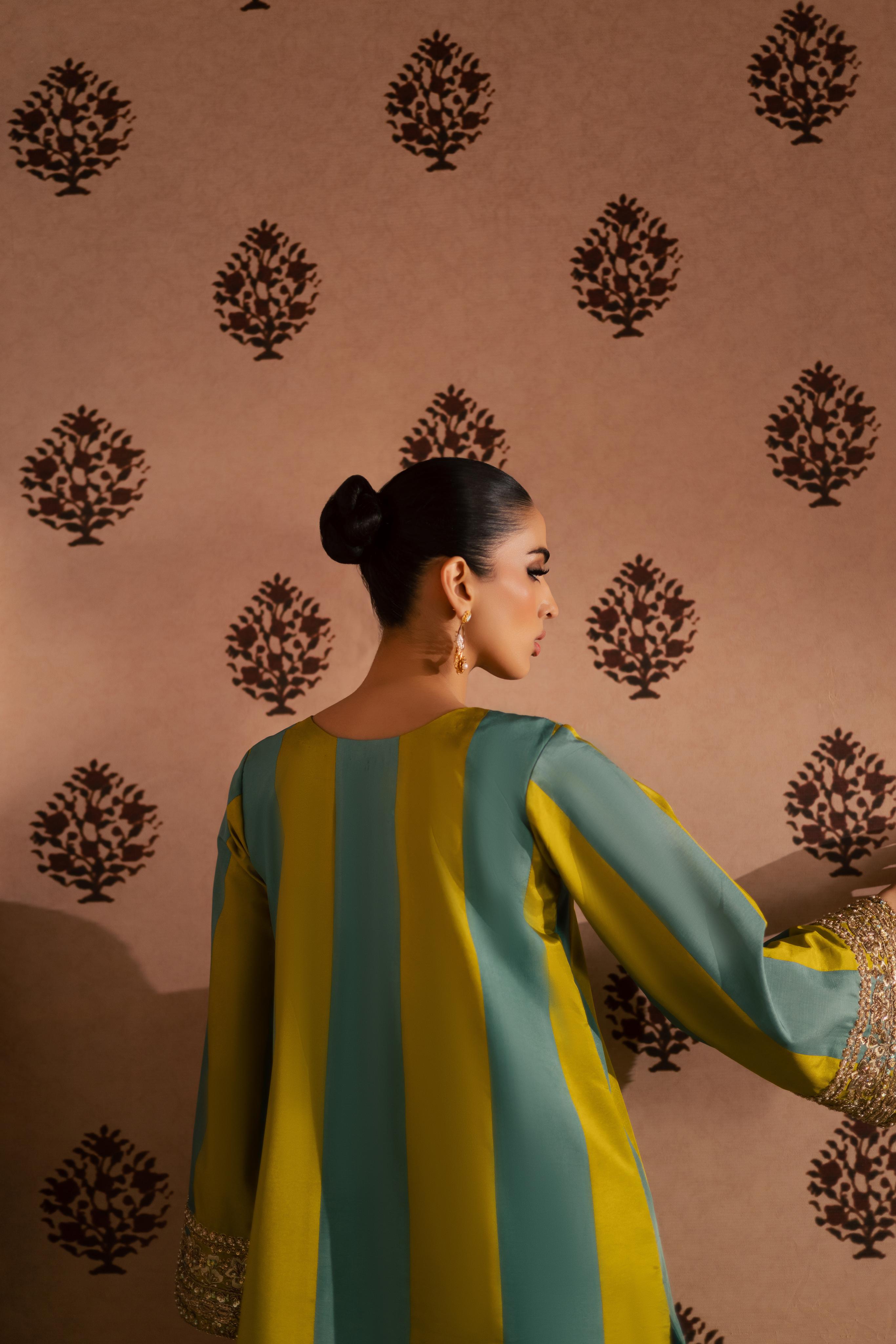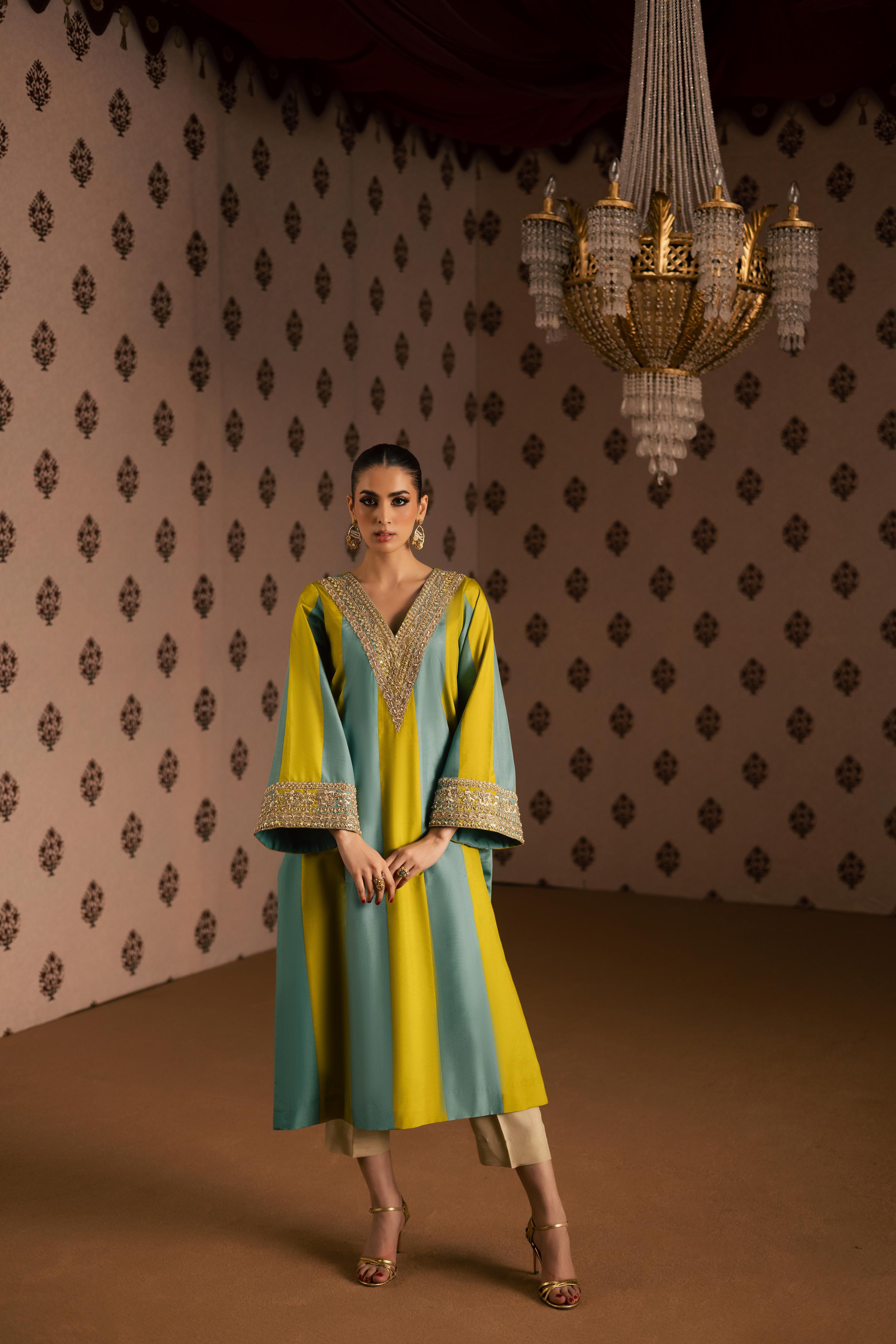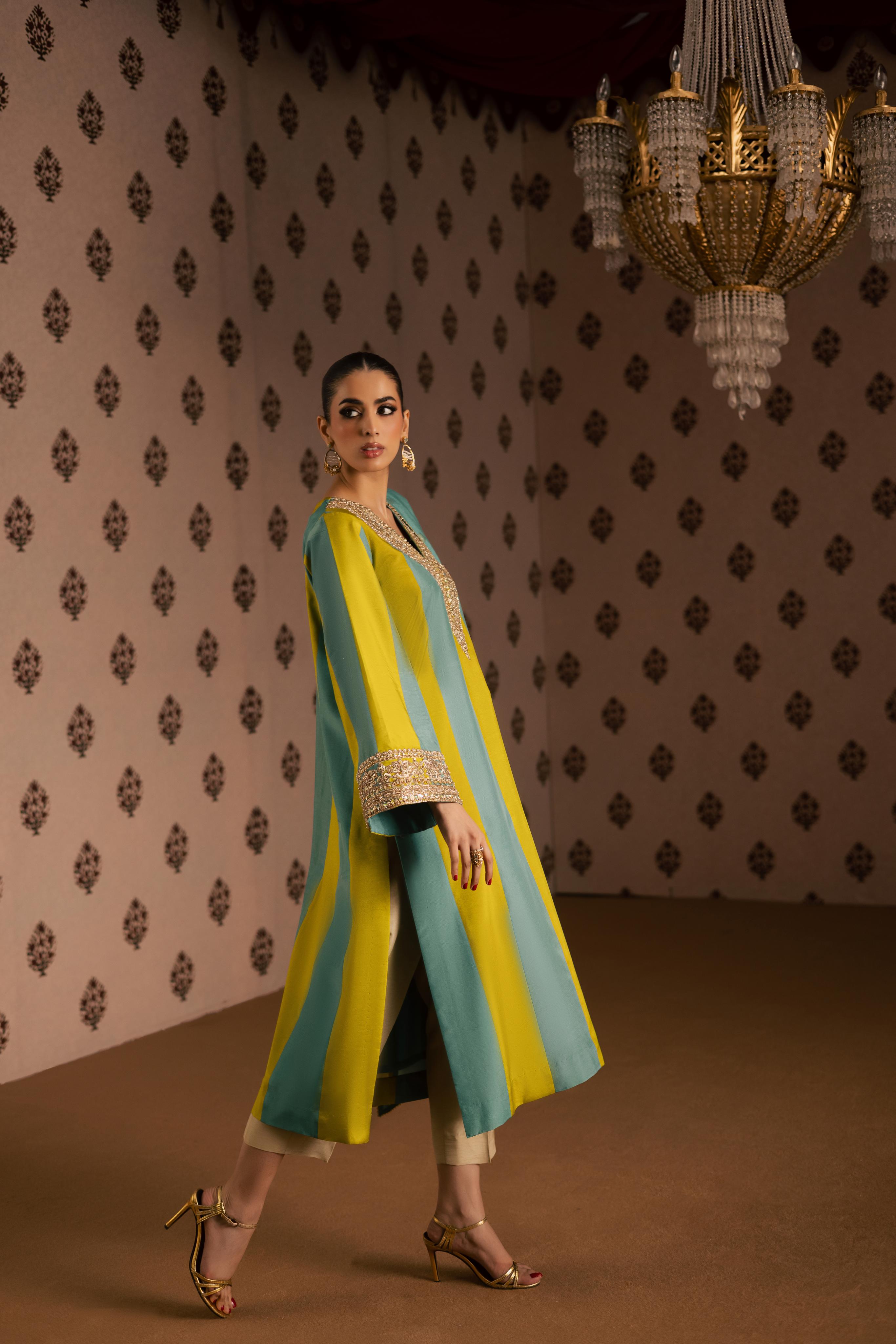 A two-tone pure sheesha silk A-line shirt with an embellished neckline and sleeves, paired with straight pants and a gajji... Read more