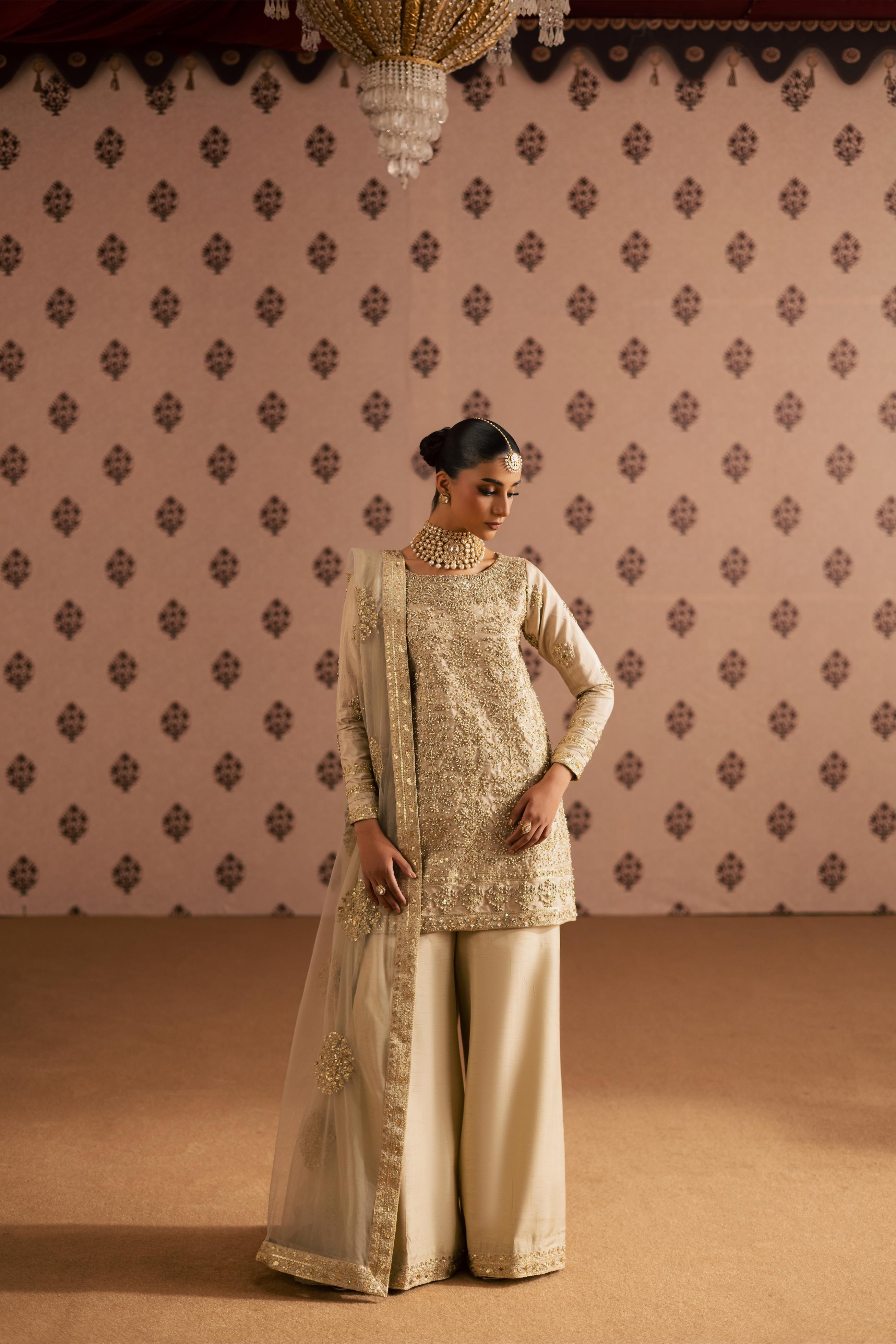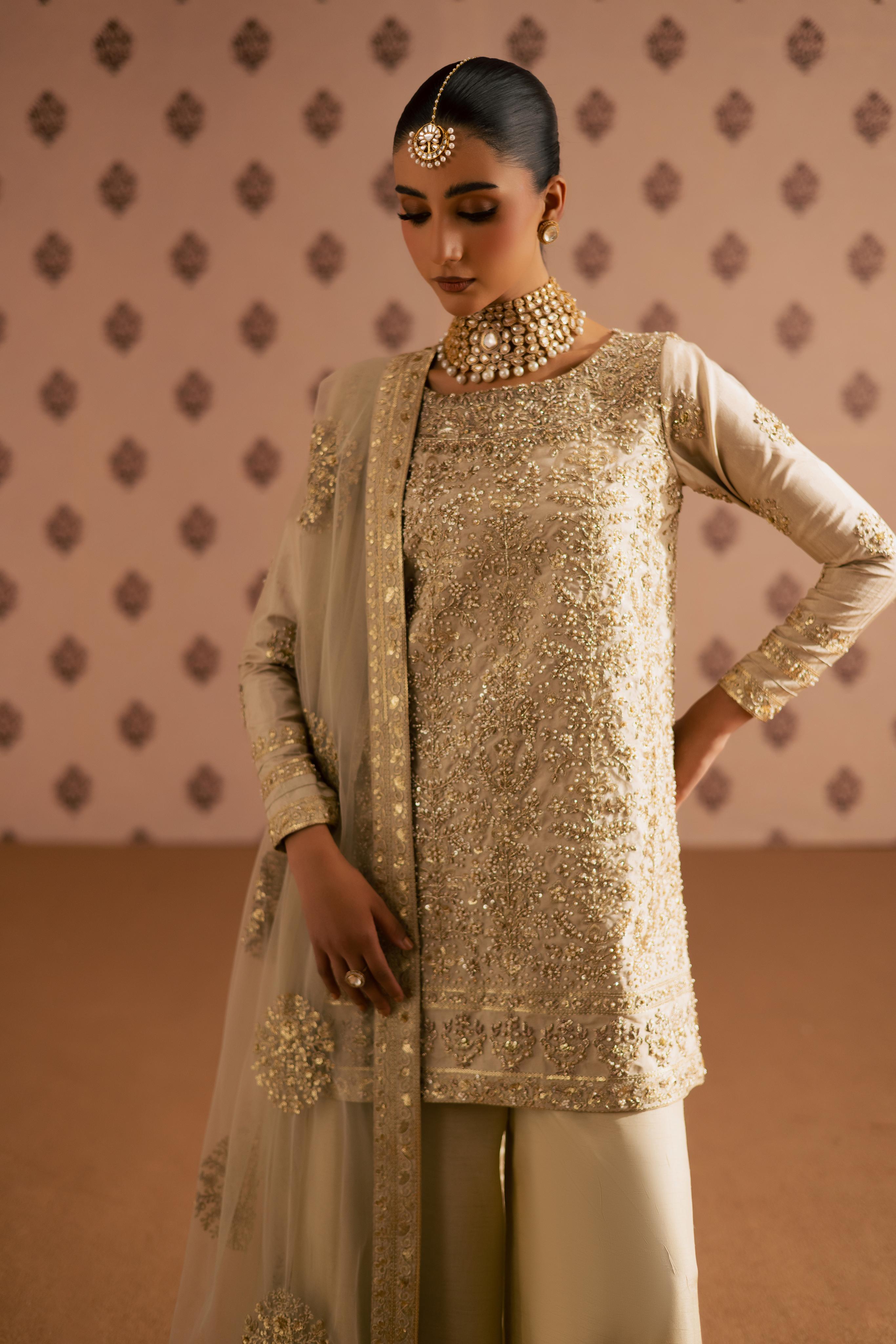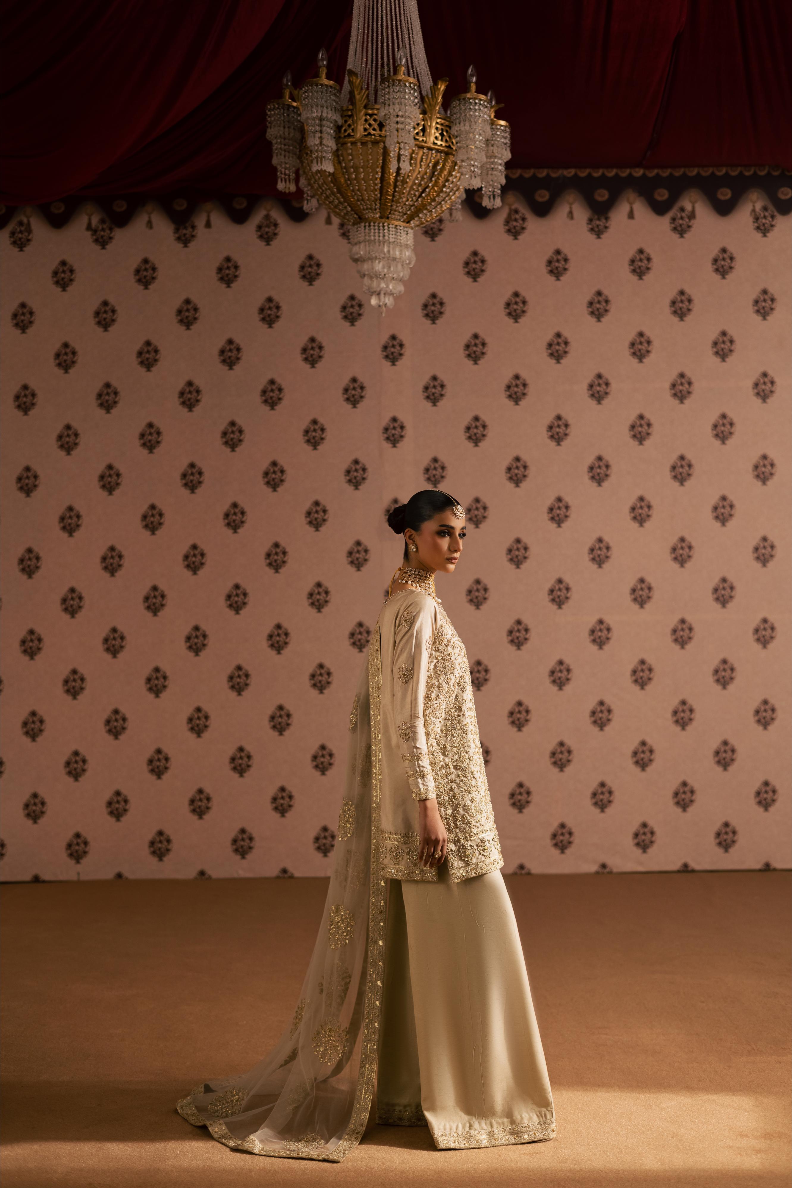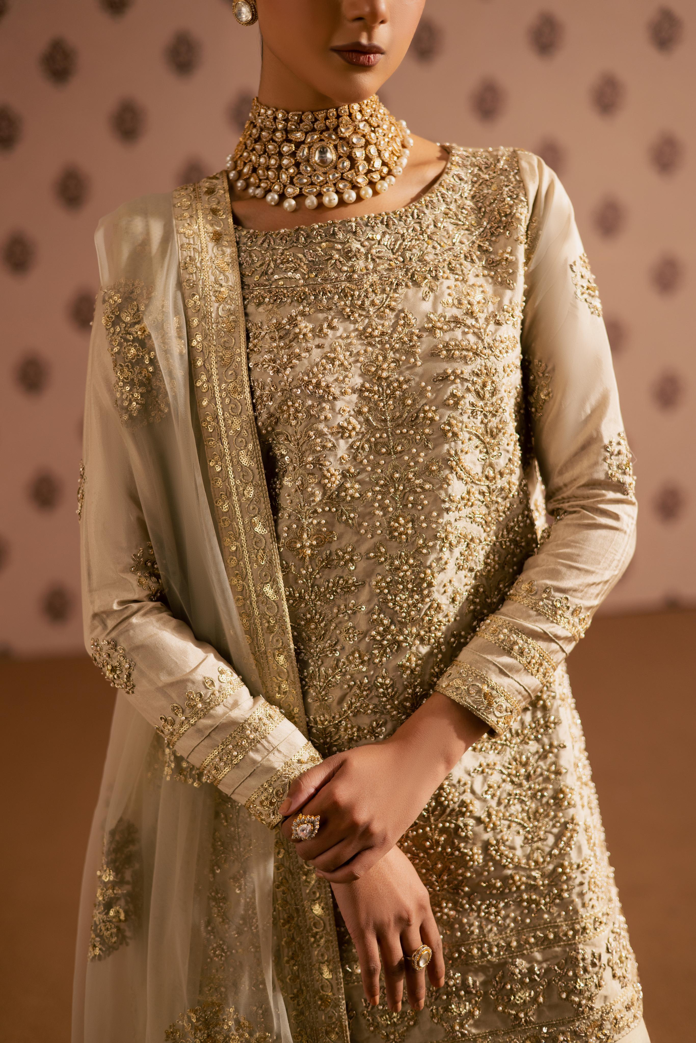 A fully embellished sheesha silk shirt with kora, dabka, tilla, sequins, pearls, and crystals on front, back, and sleeves. Paired... Read more