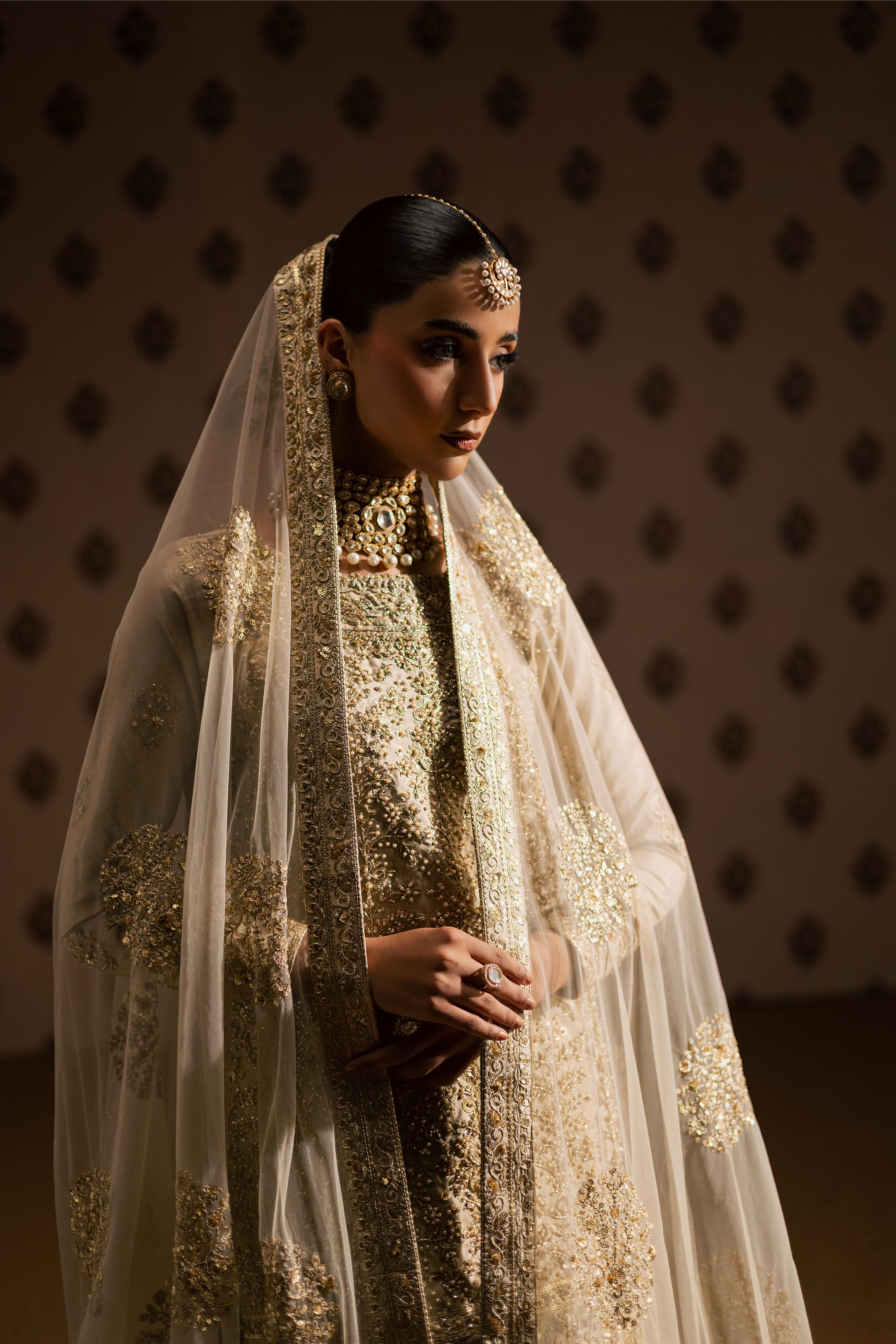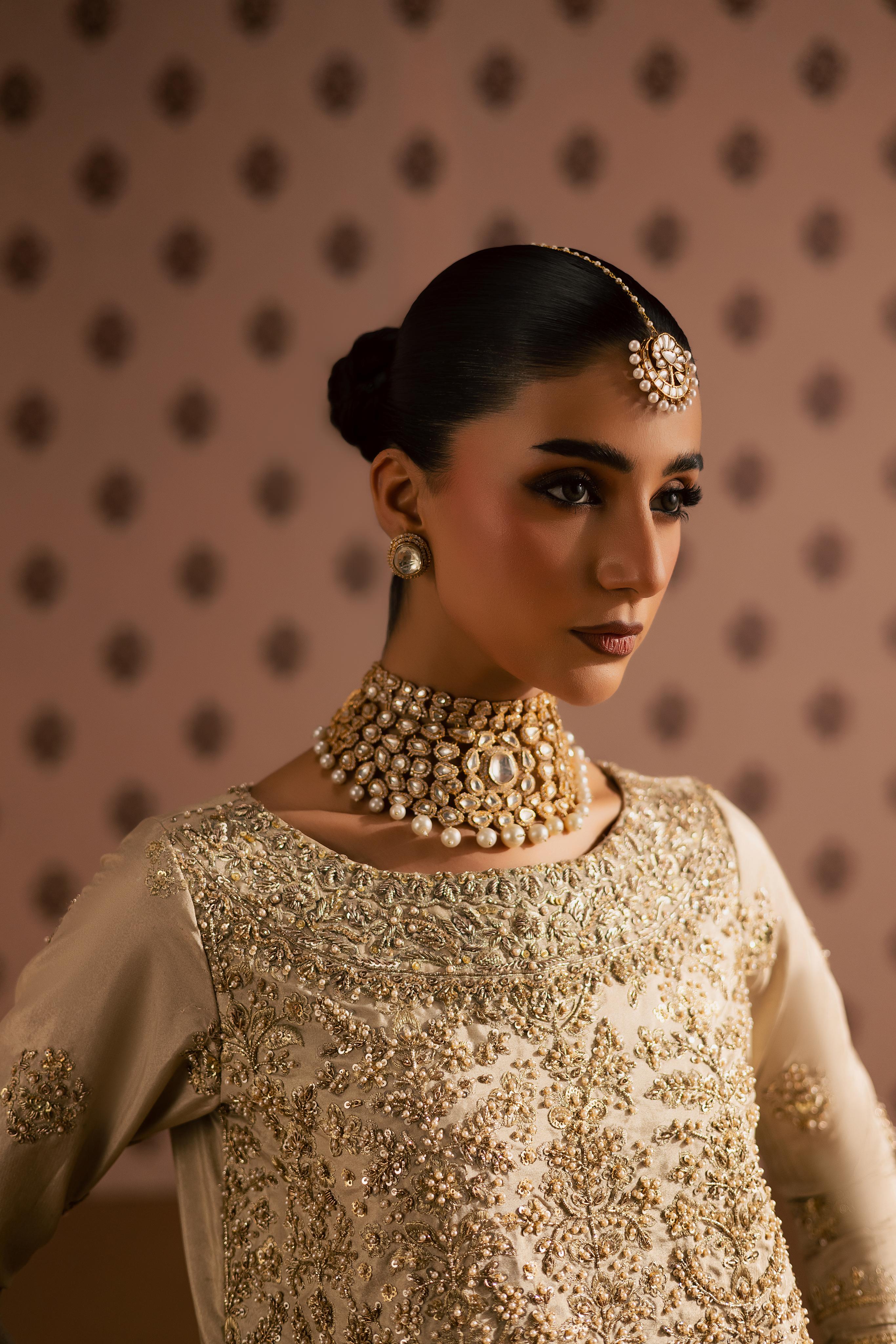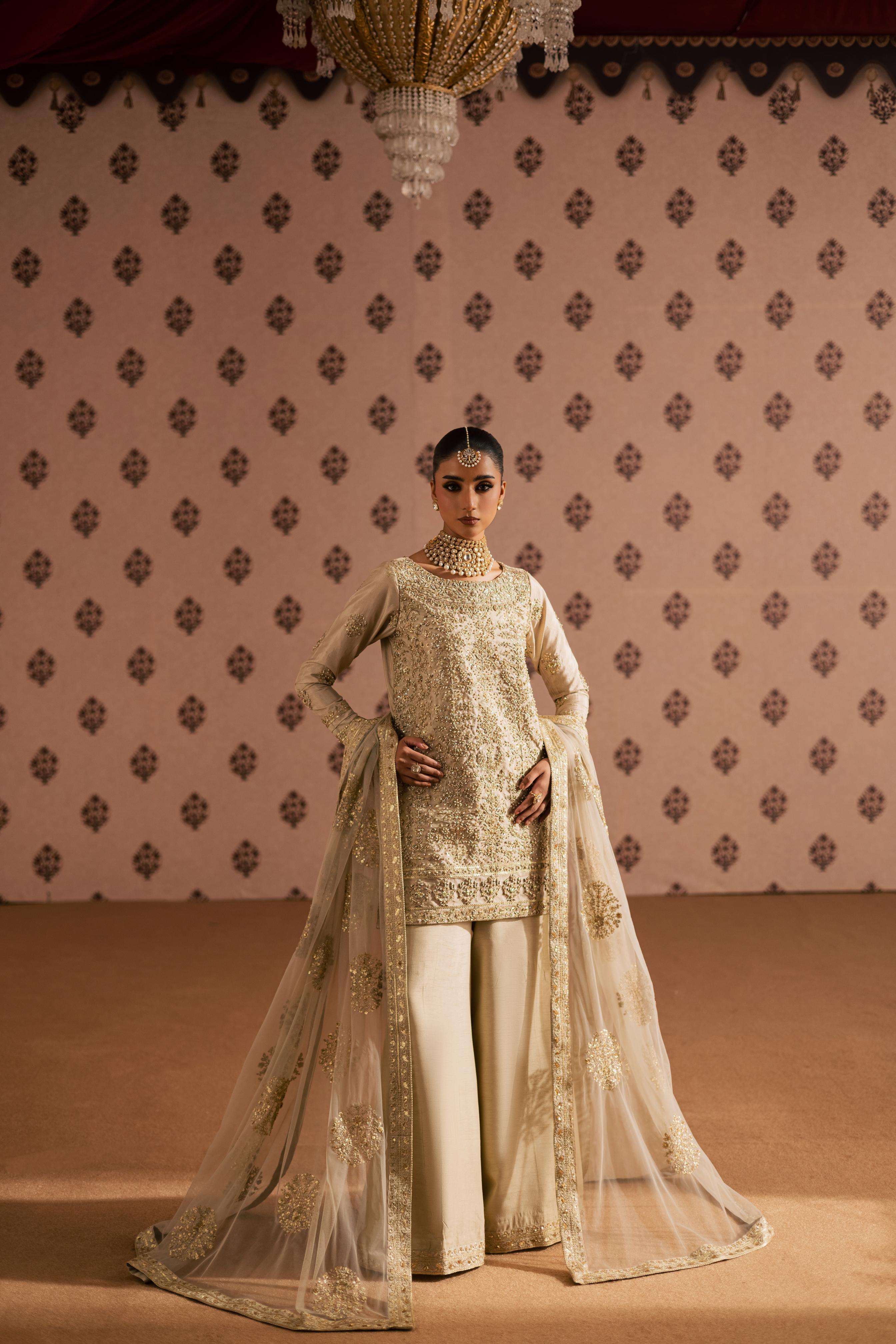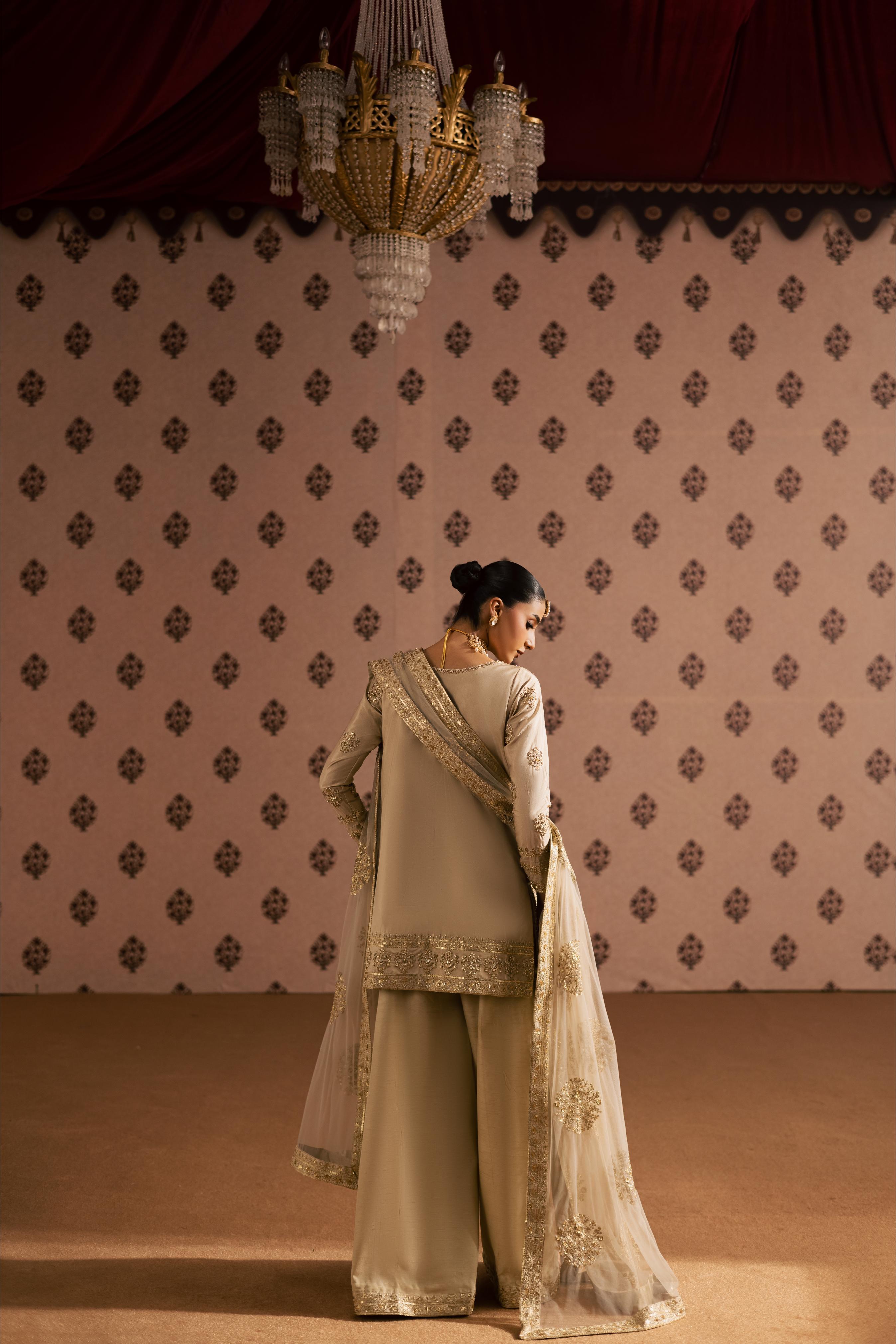 A fully embellished sheesha silk shirt with kora, dabka, tilla, sequins, pearls, and crystals on front, back, and sleeves. Paired... Read more