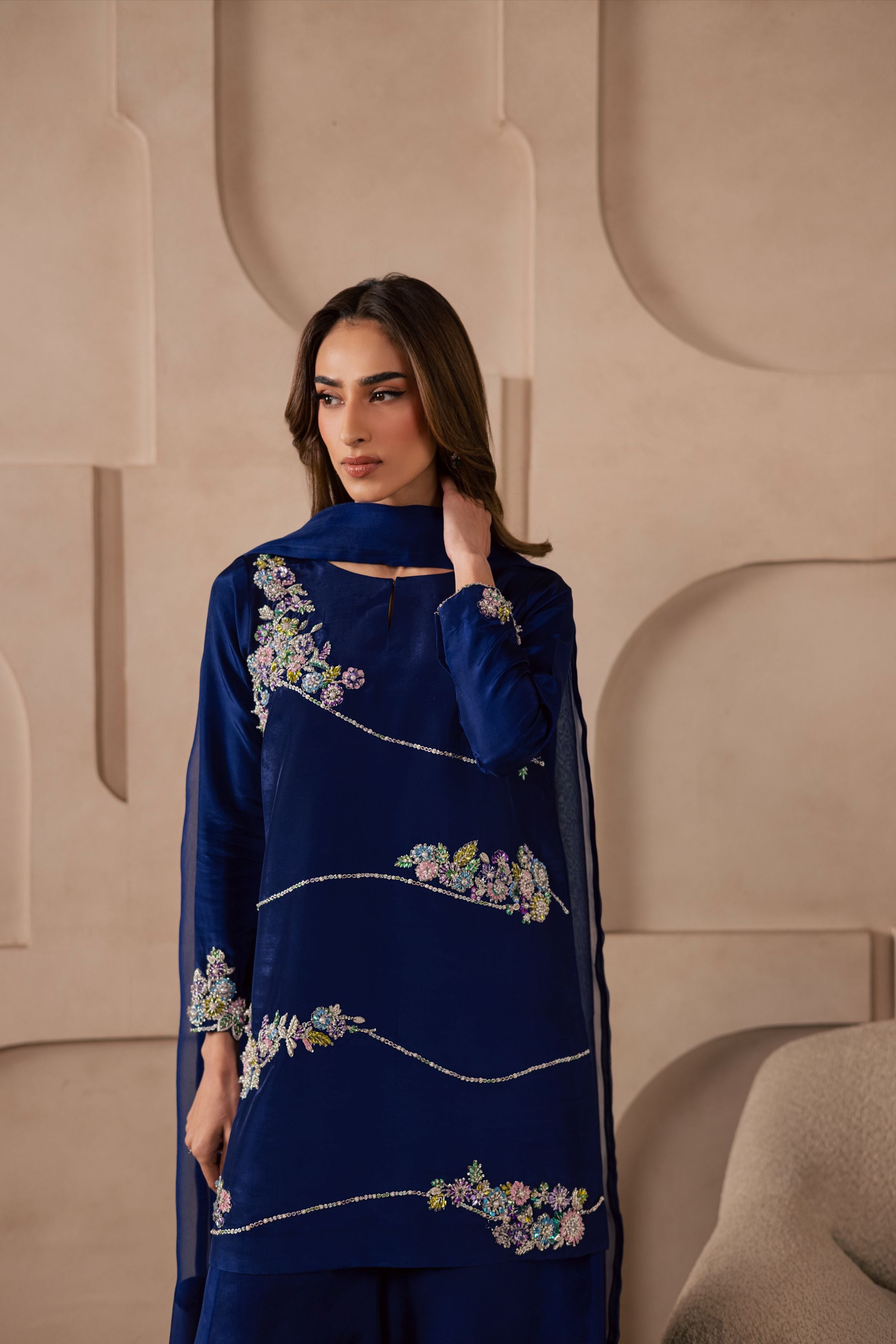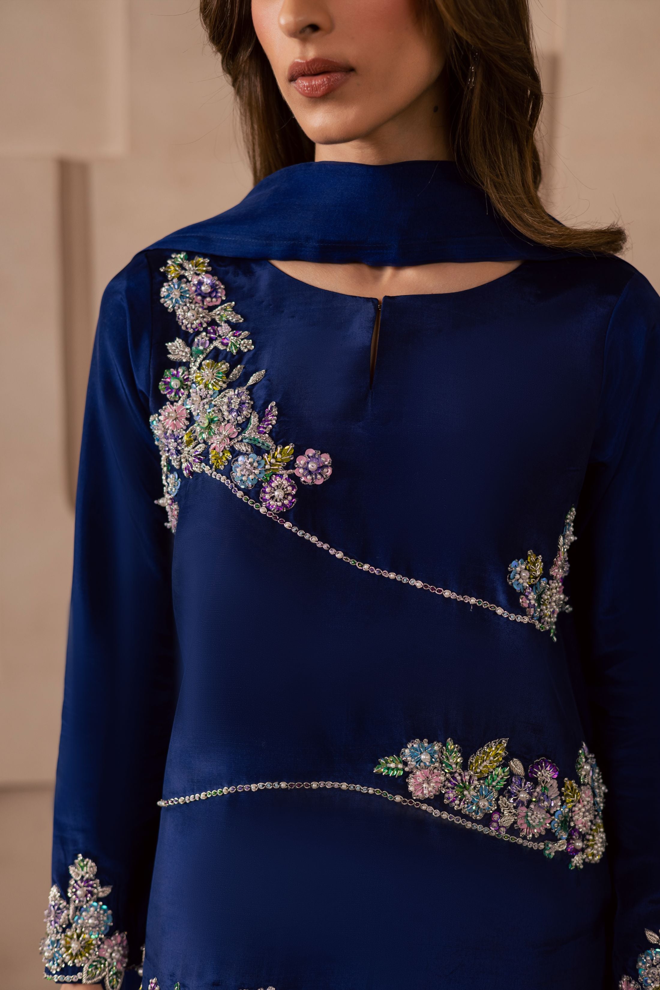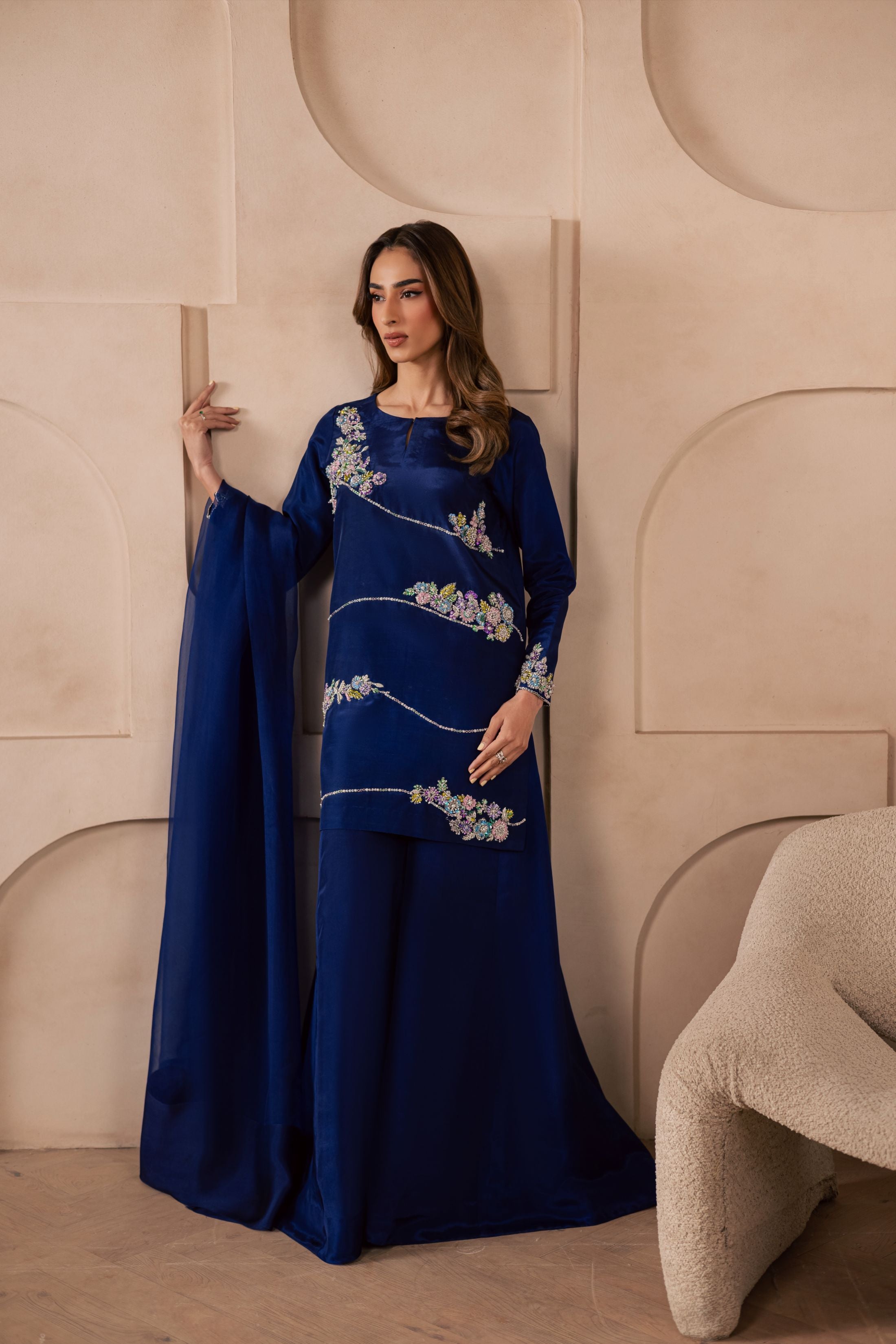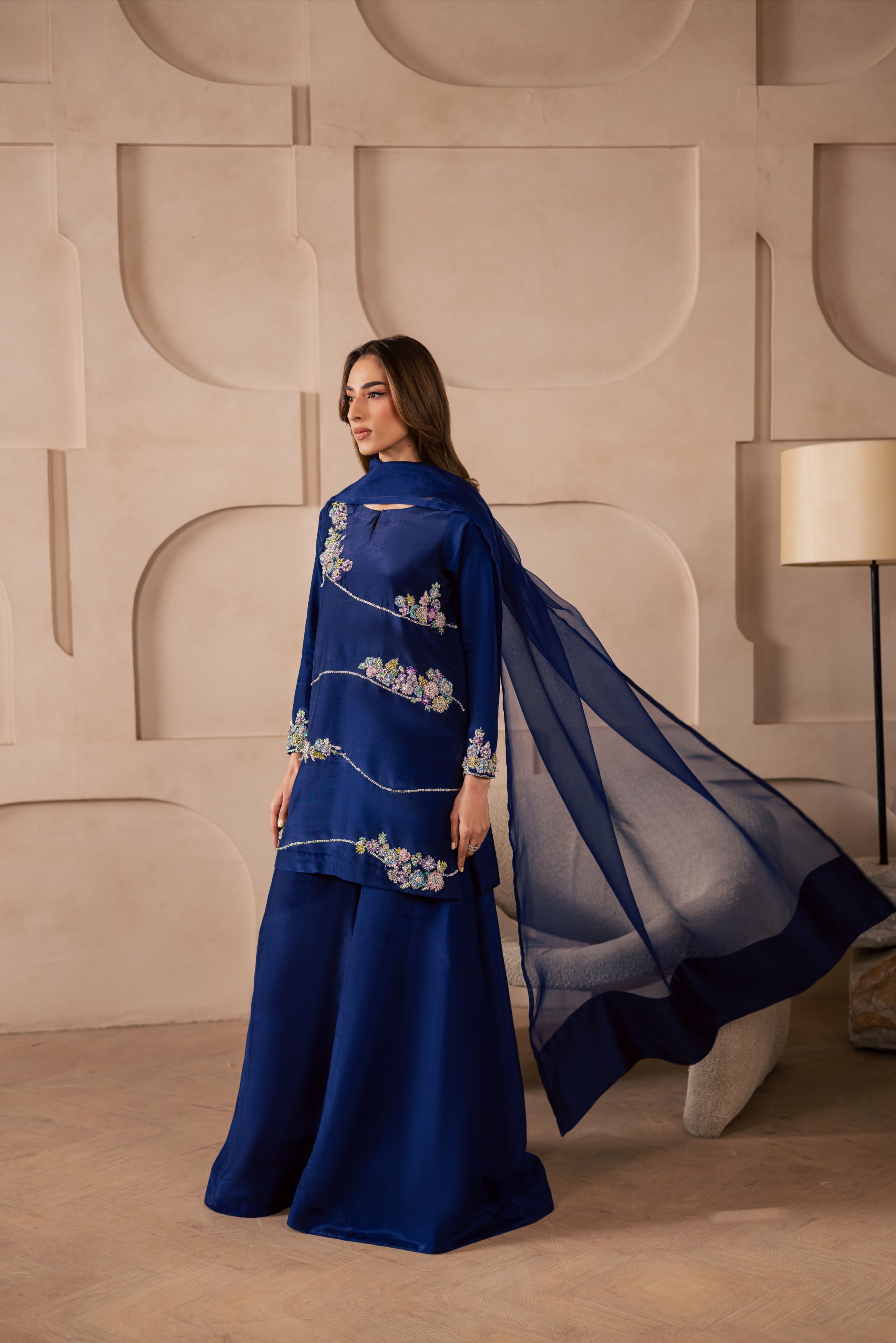 A three-piece ensemble crafted on a sheesha silk base, featuring a heavily embellished front adorned with pastel floral motifs, intricately... Read more