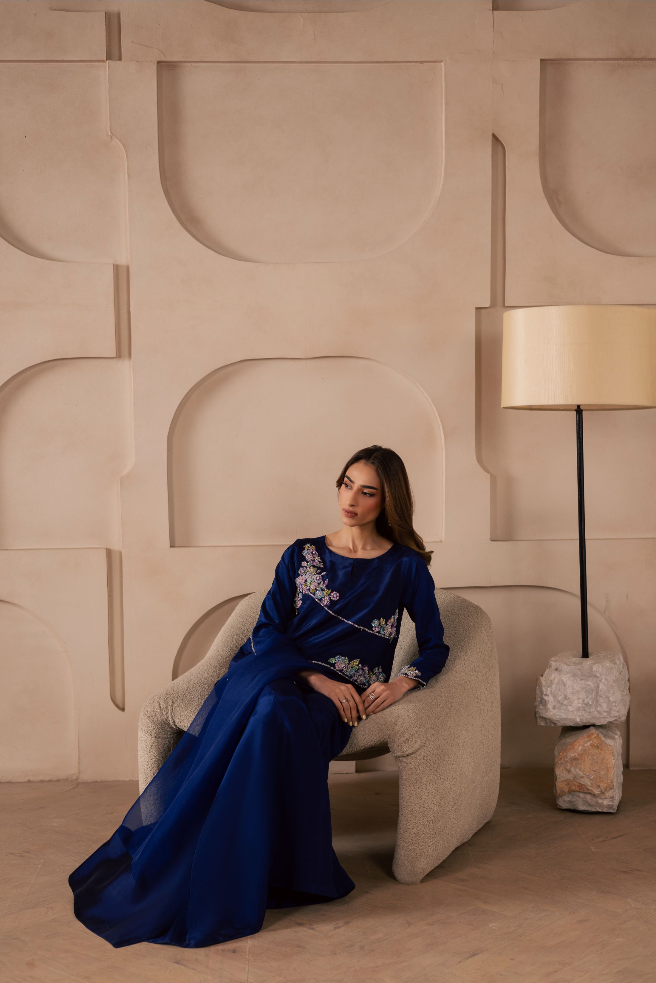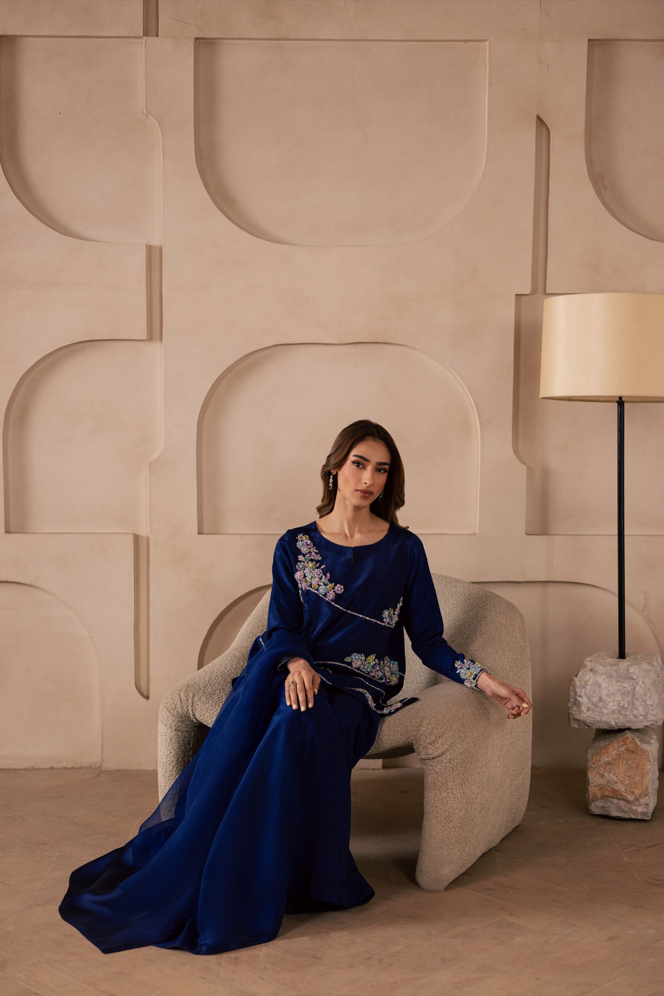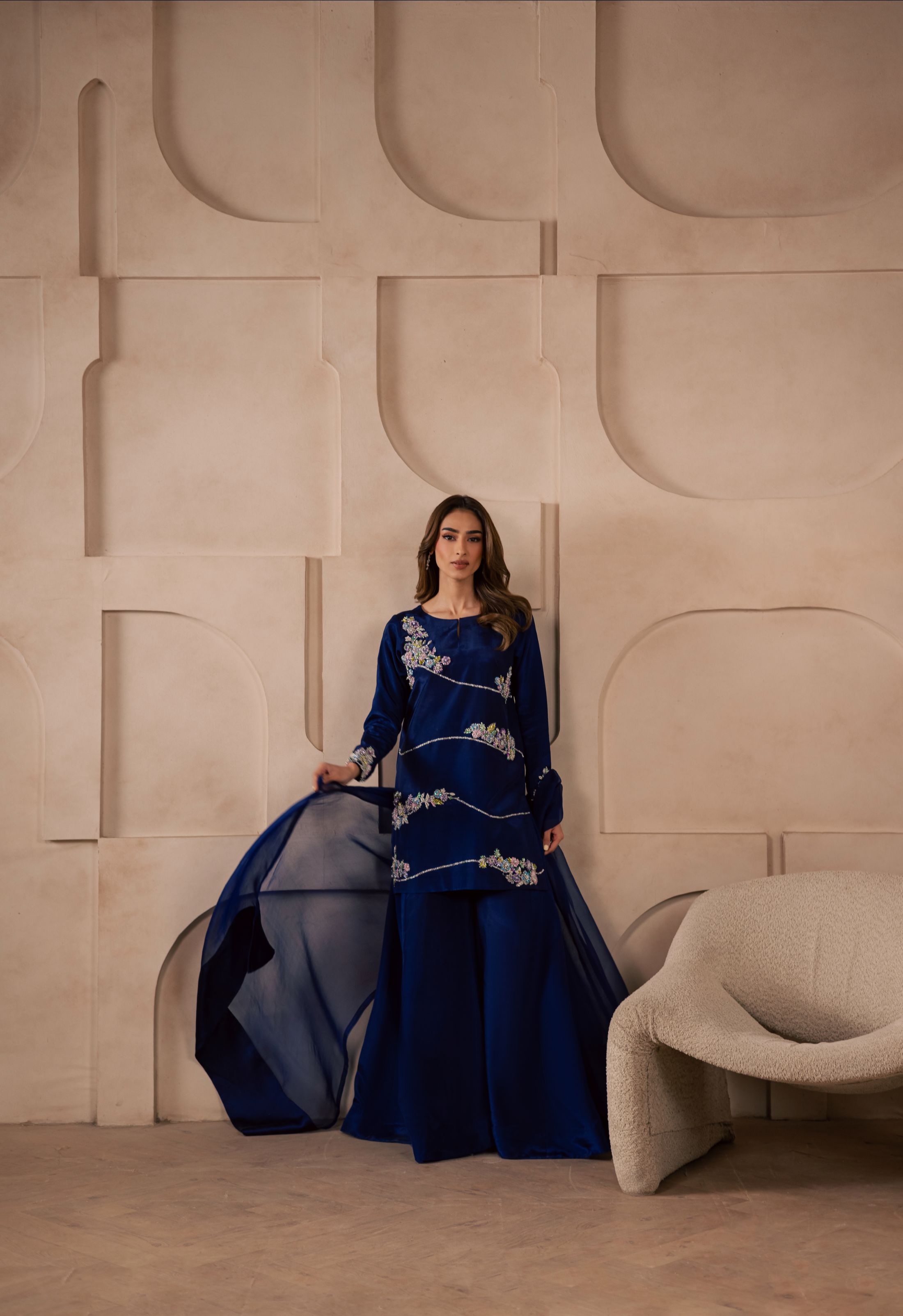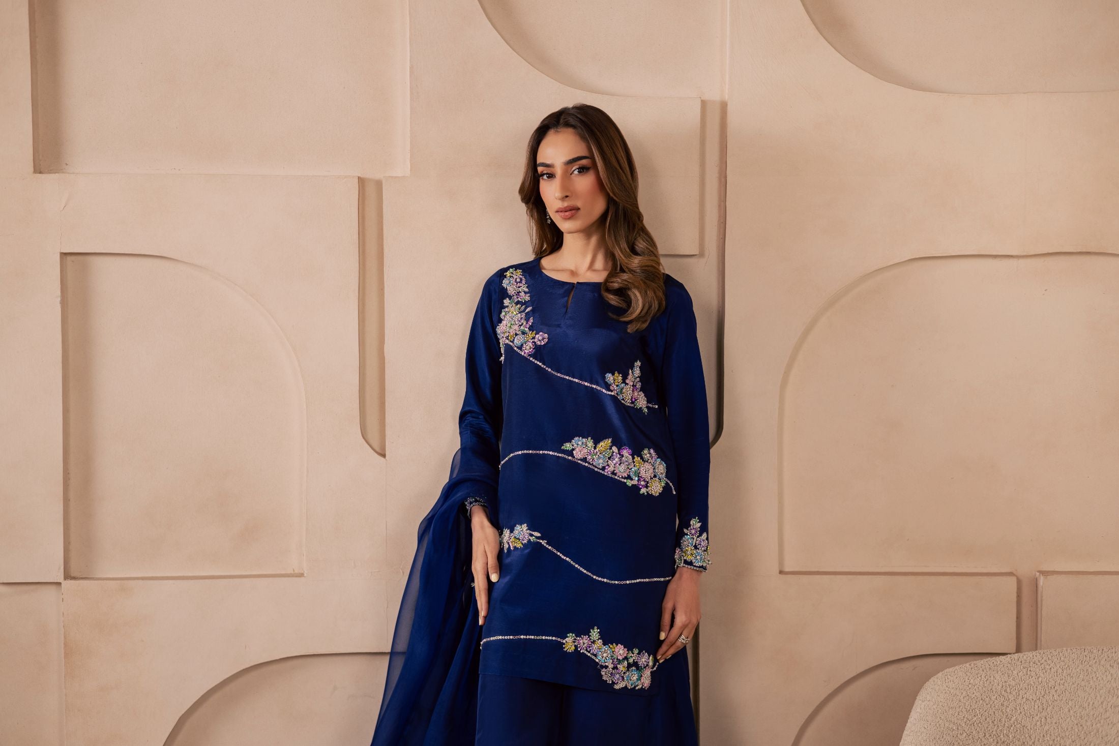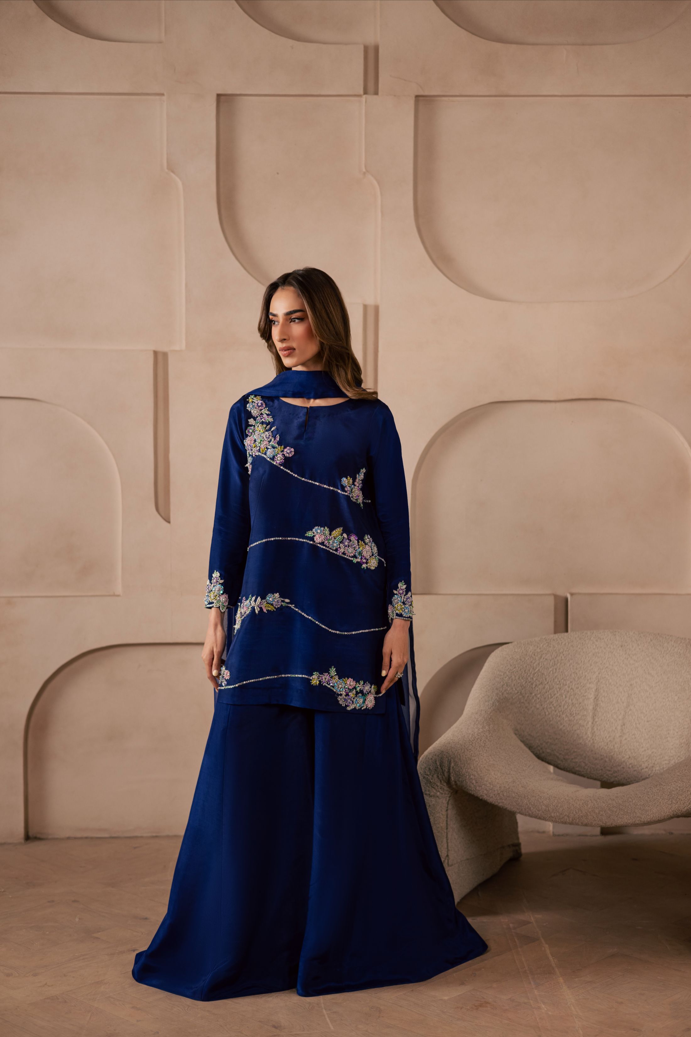 A three-piece ensemble crafted on a sheesha silk base, featuring a heavily embellished front adorned with pastel floral motifs, intricately... Read more