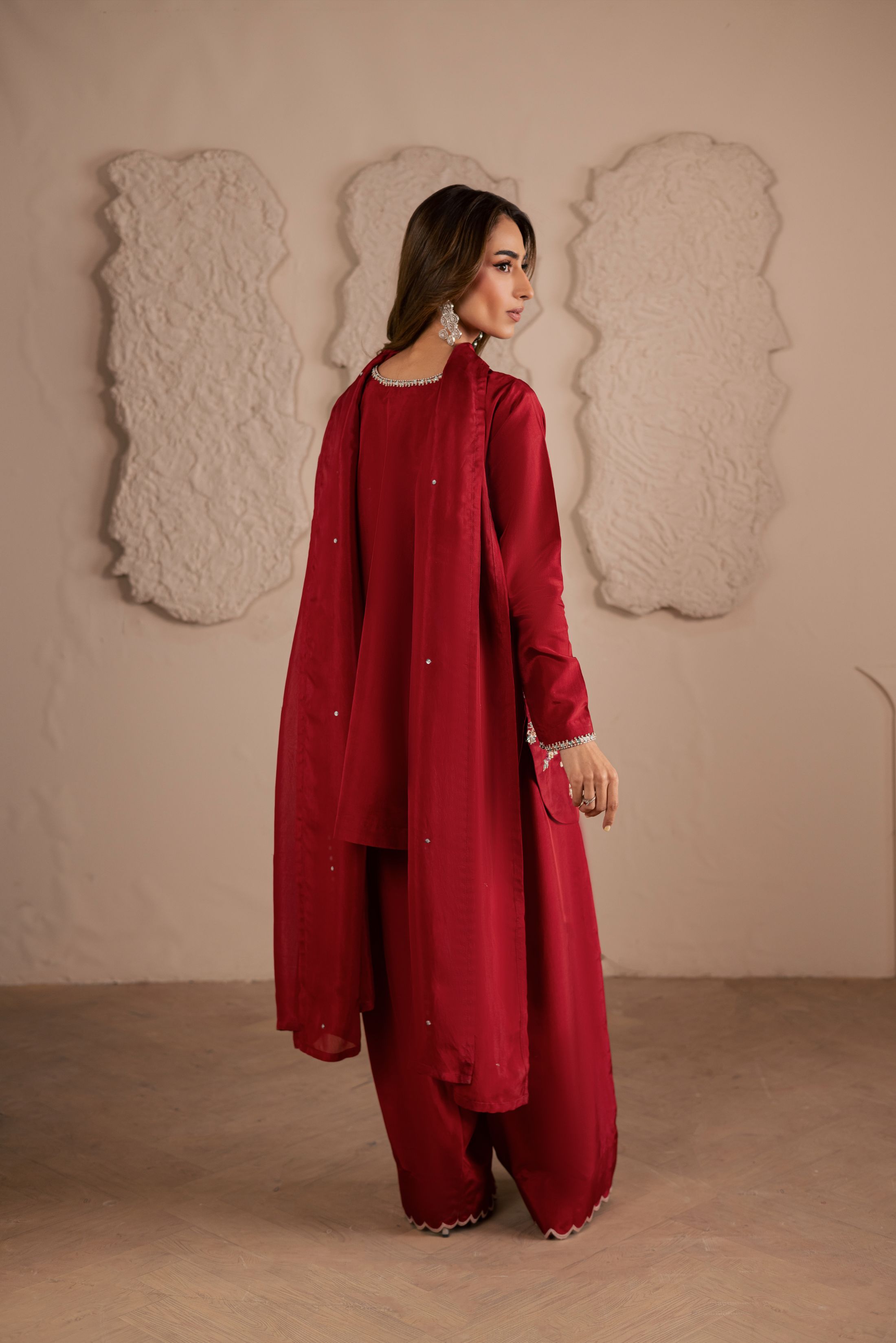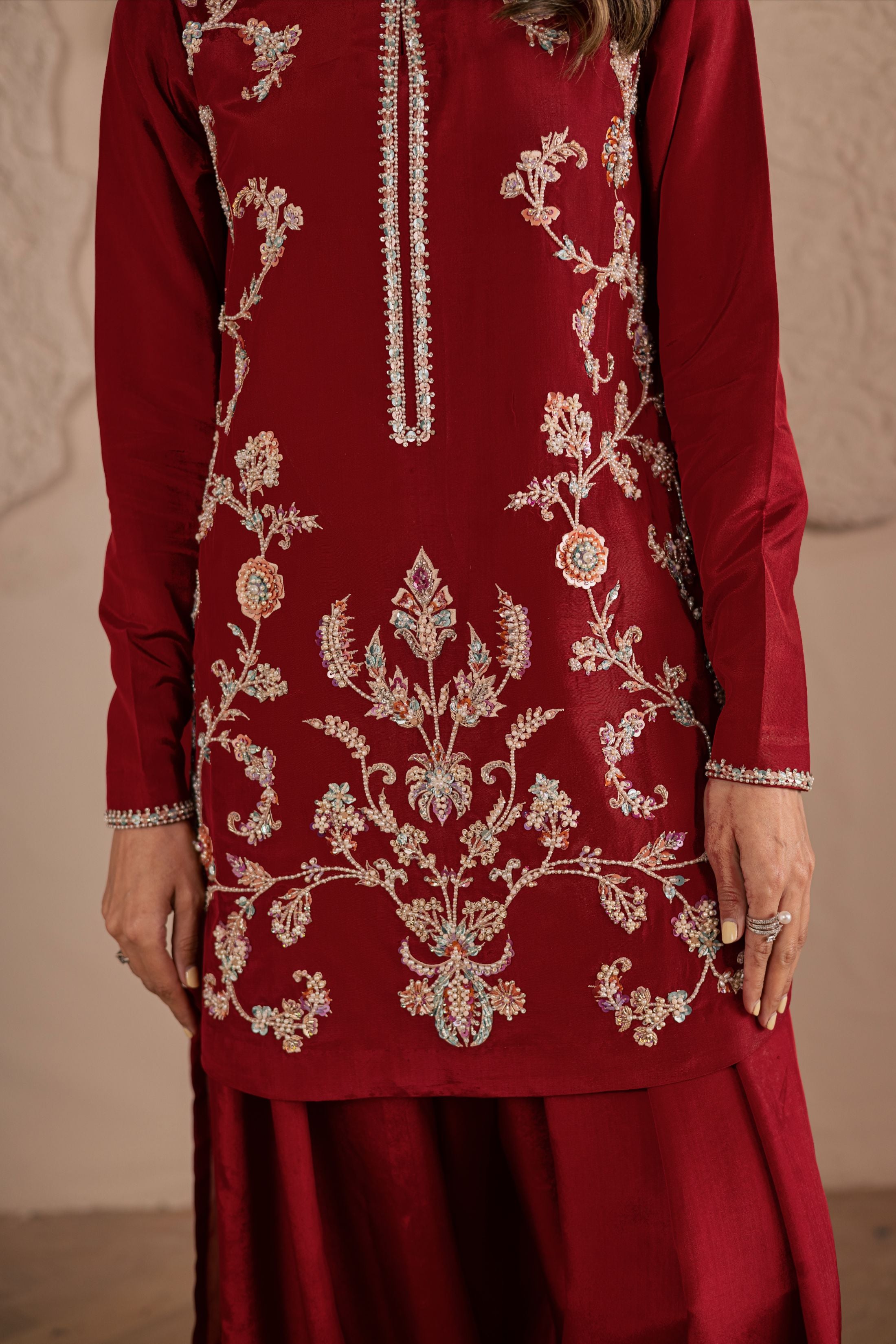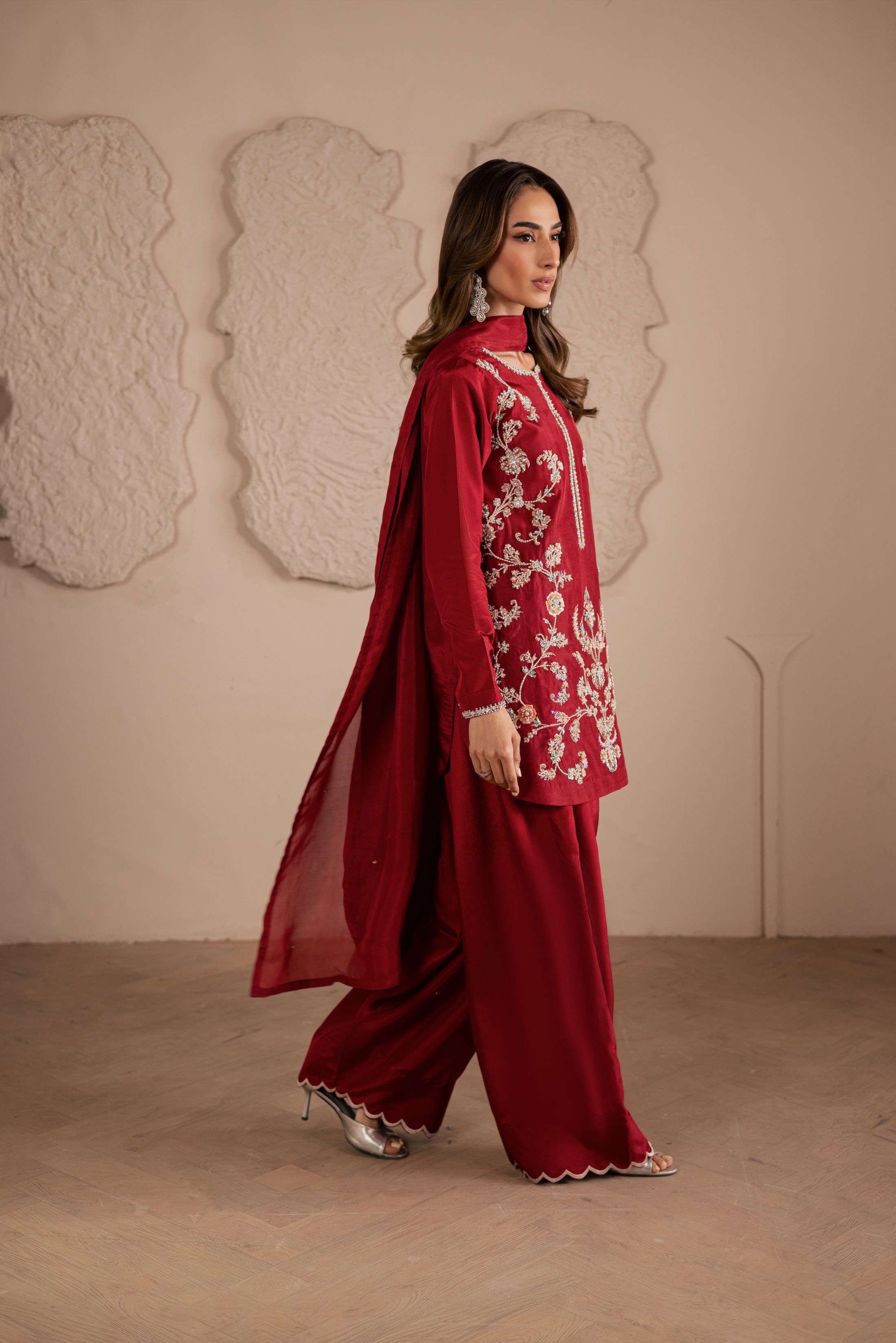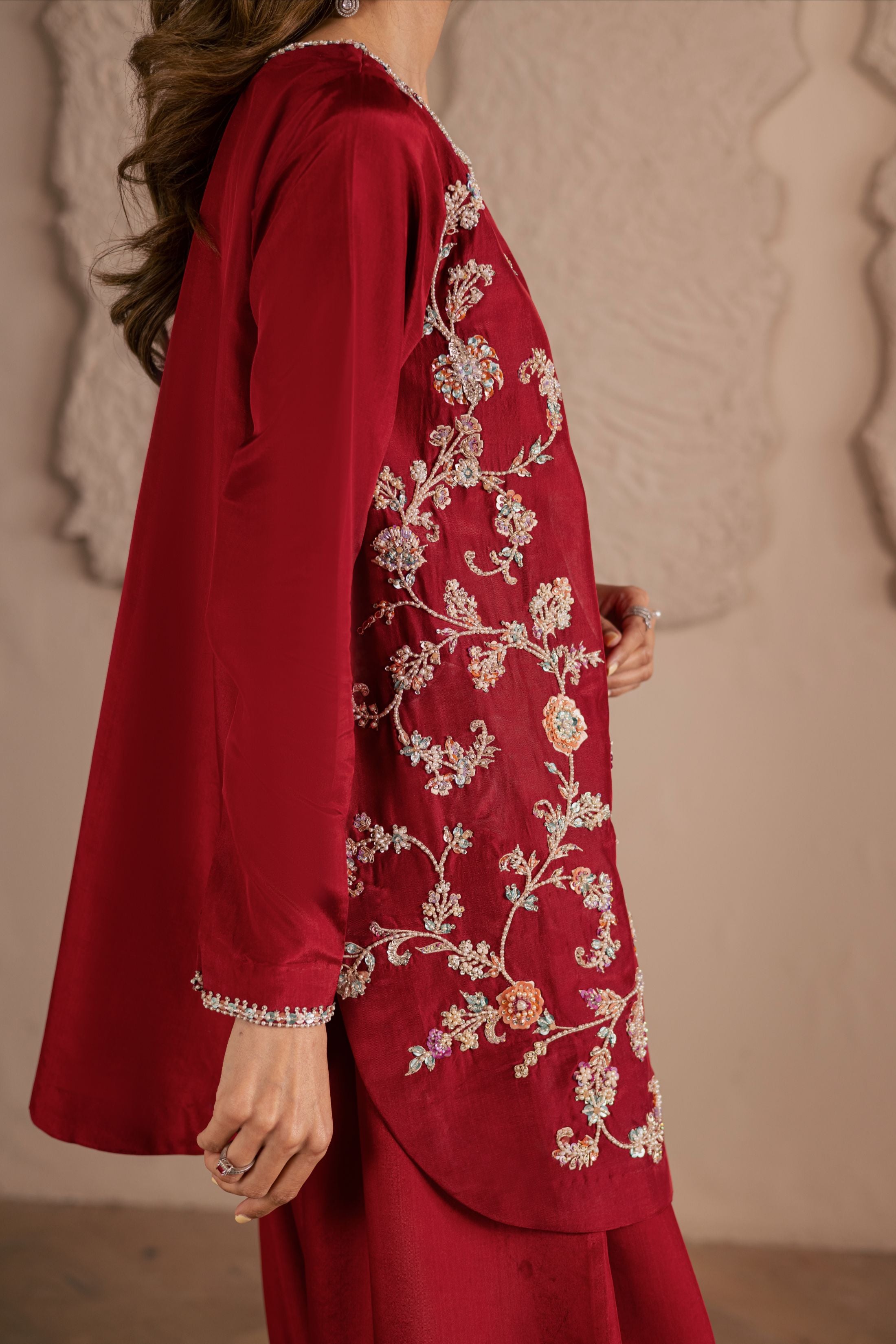 A three-piece ensemble crafted on a pure sheesha silk base, adorned with meticulous handwork of crystals, pearls, and sequins in... Read more