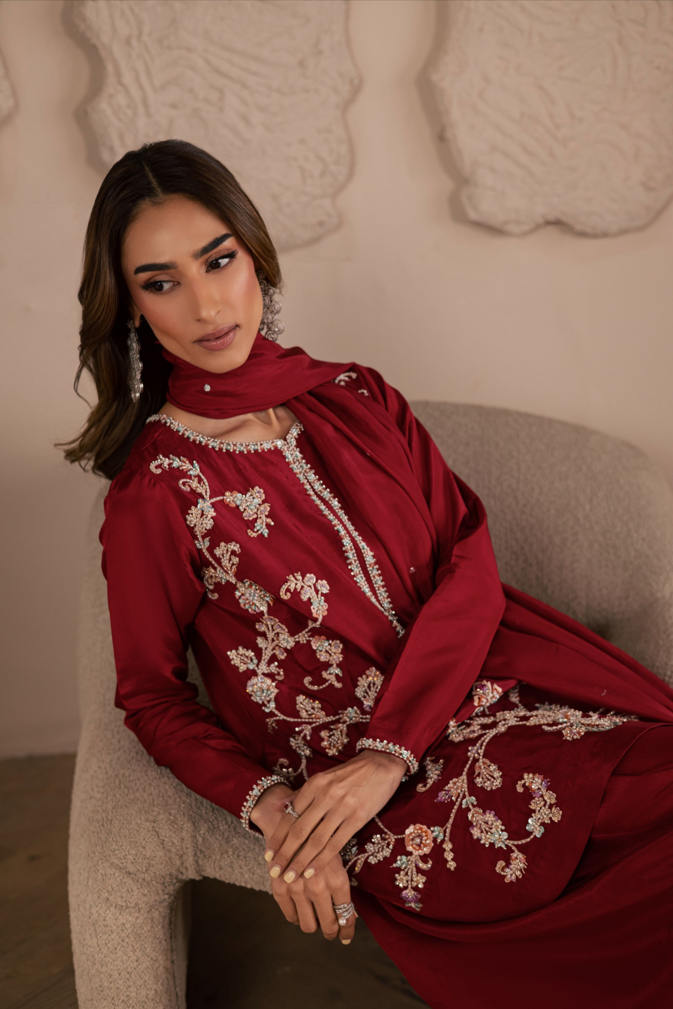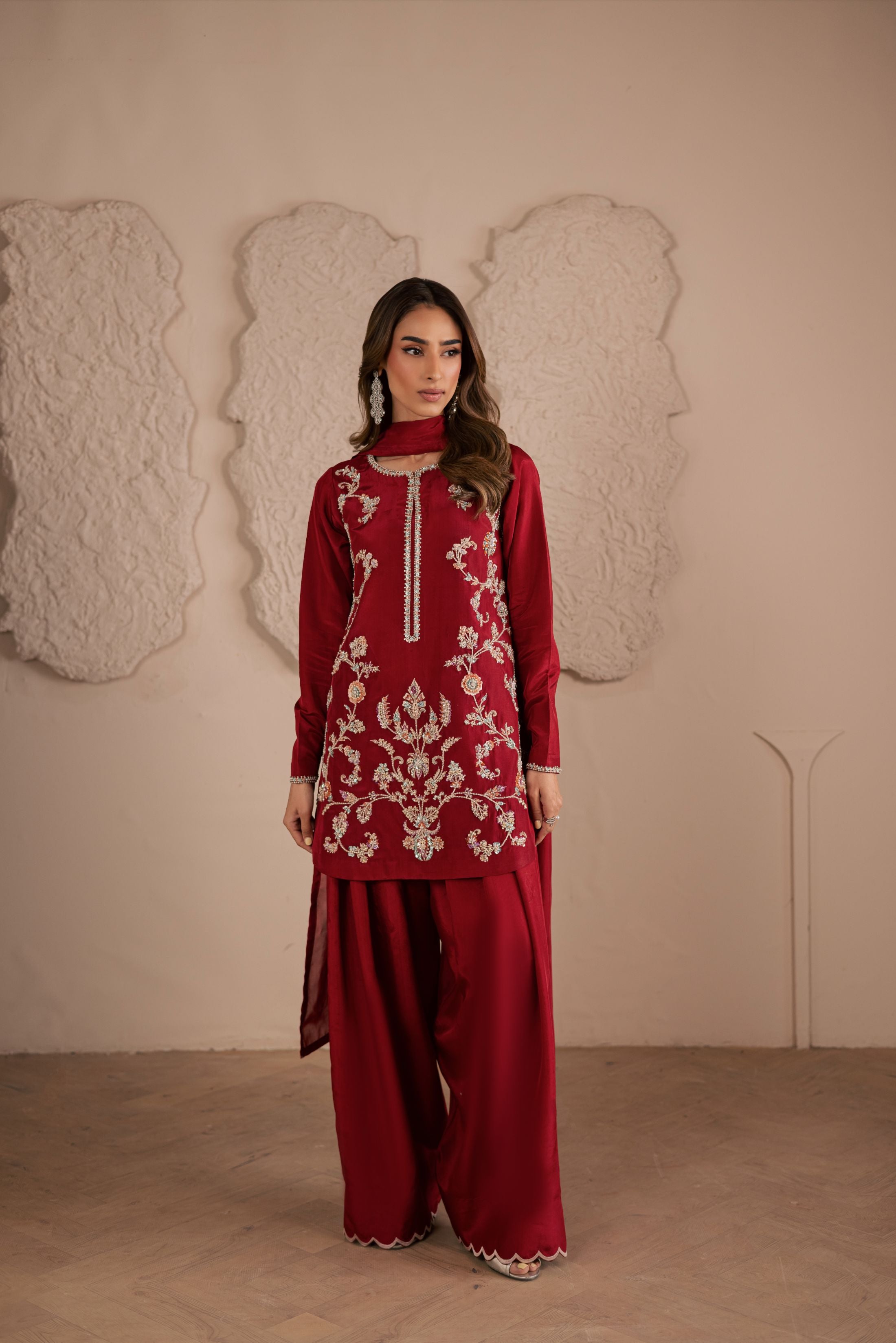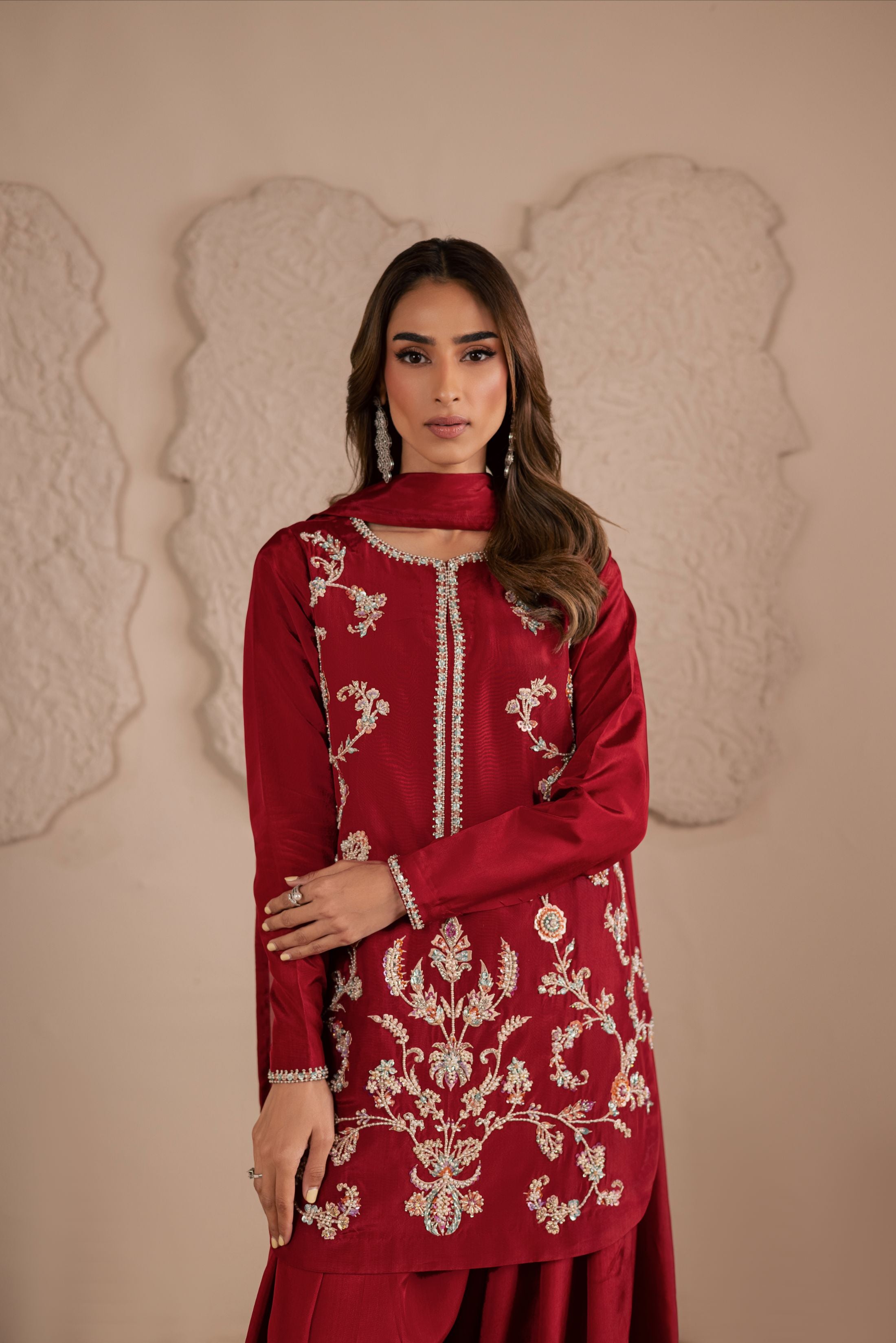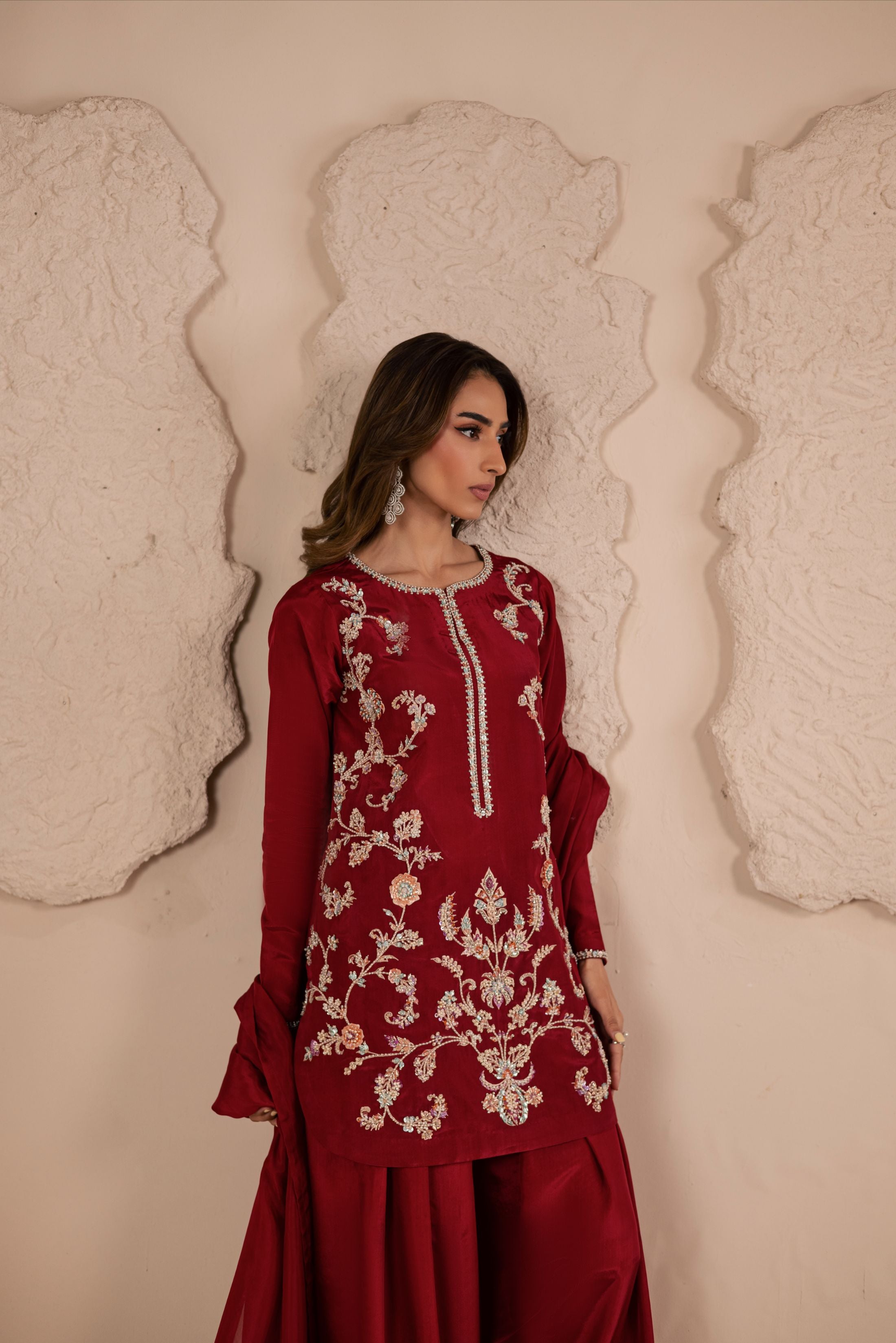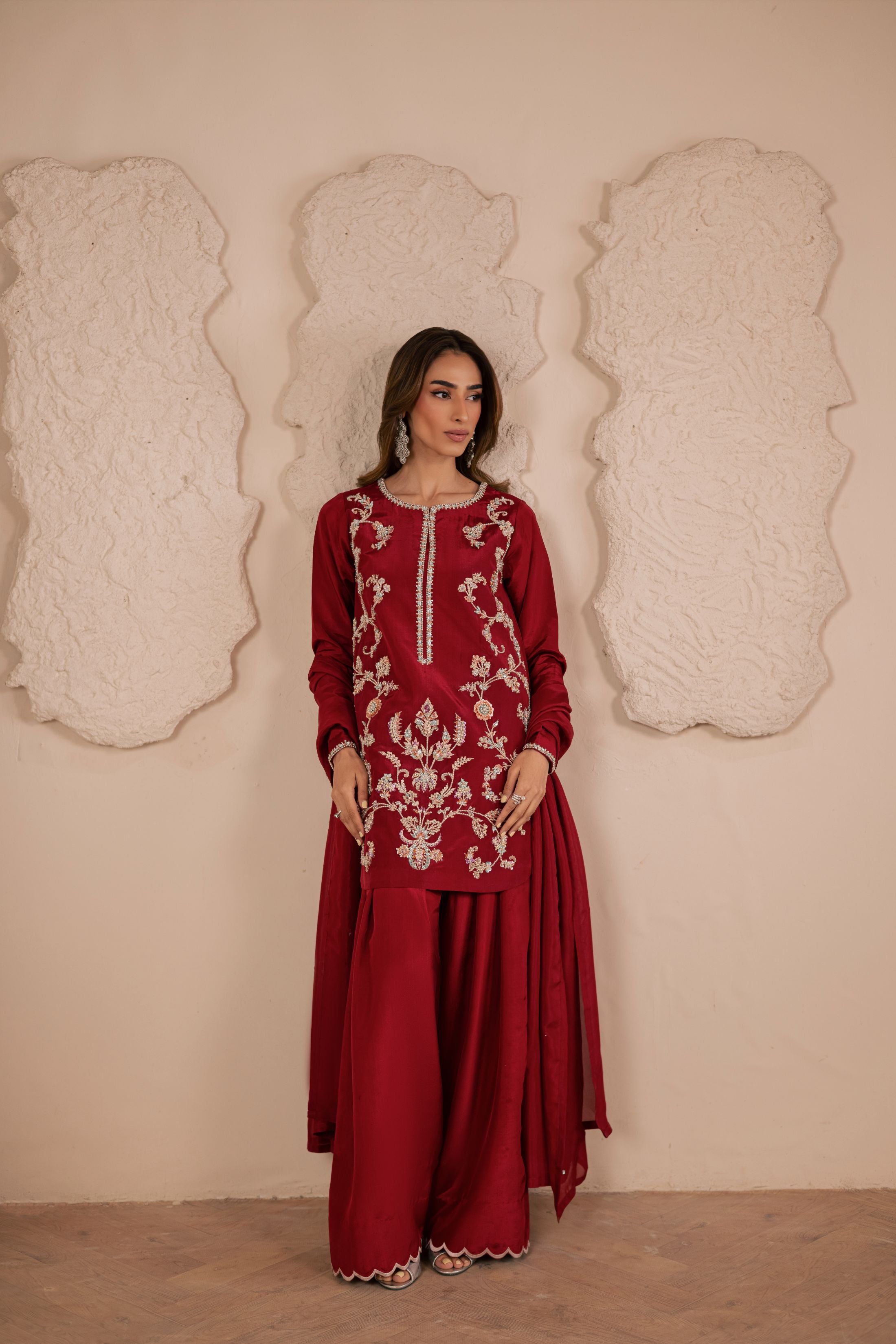 A three-piece ensemble crafted on a pure sheesha silk base, adorned with meticulous handwork of crystals, pearls, and sequins in... Read more