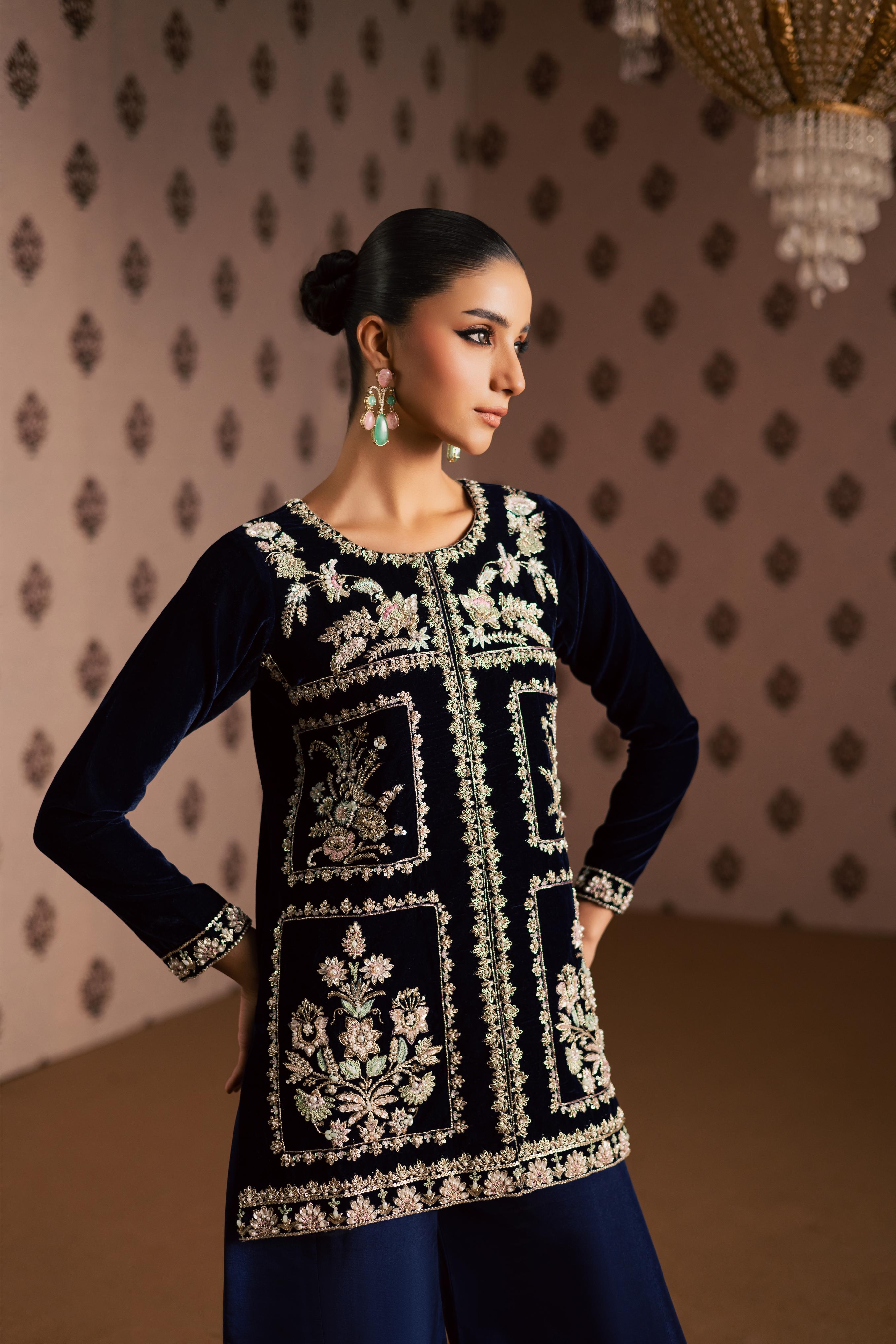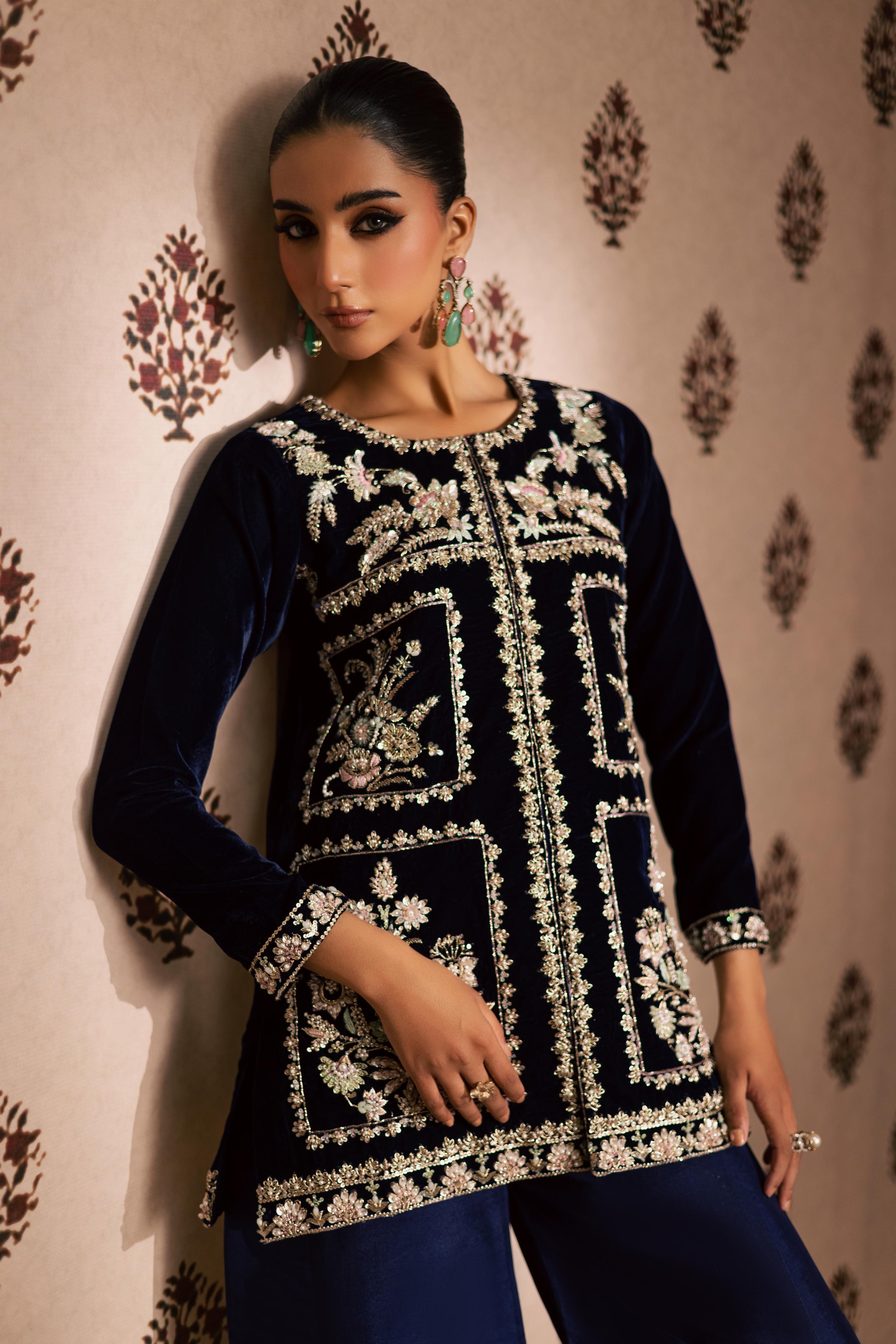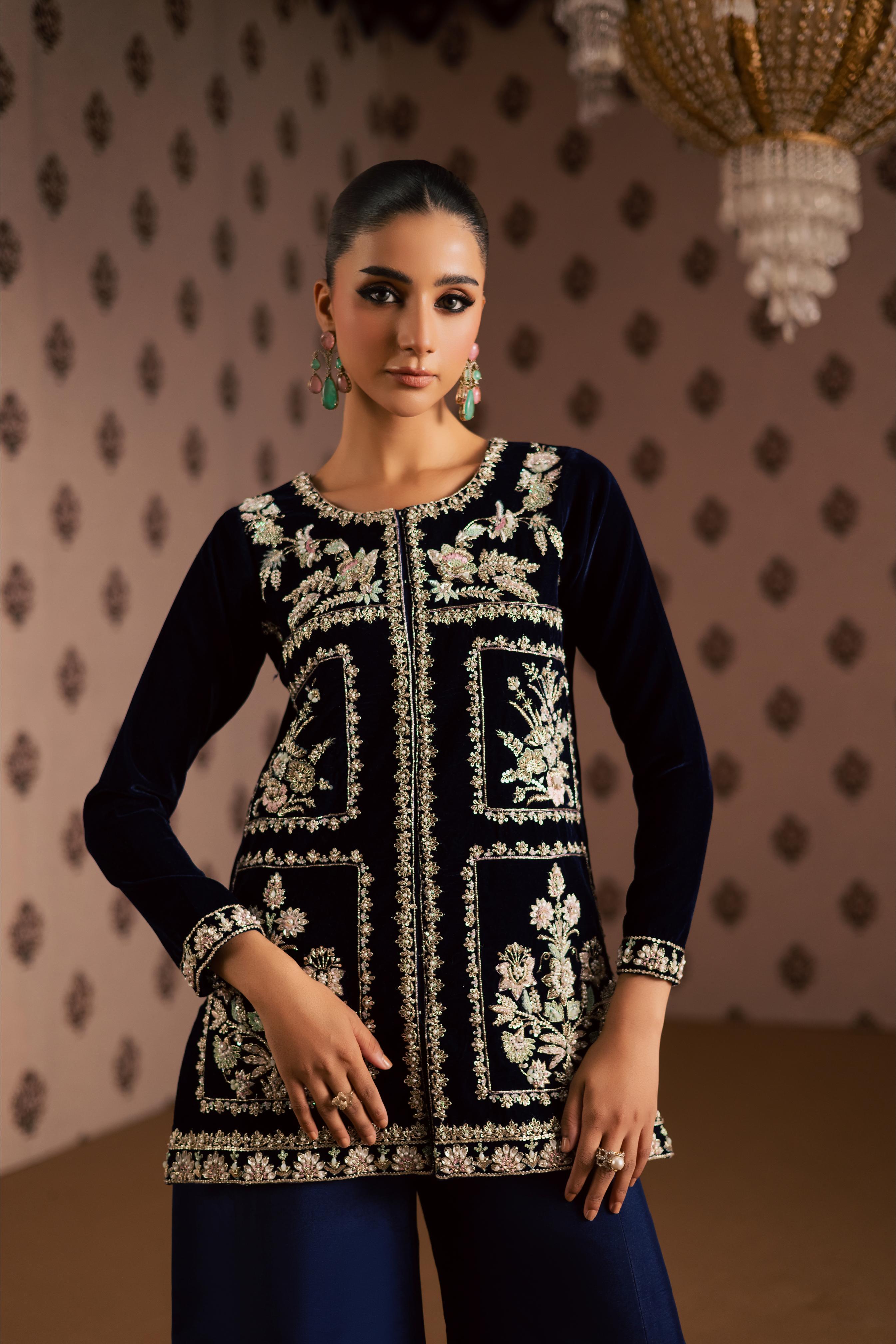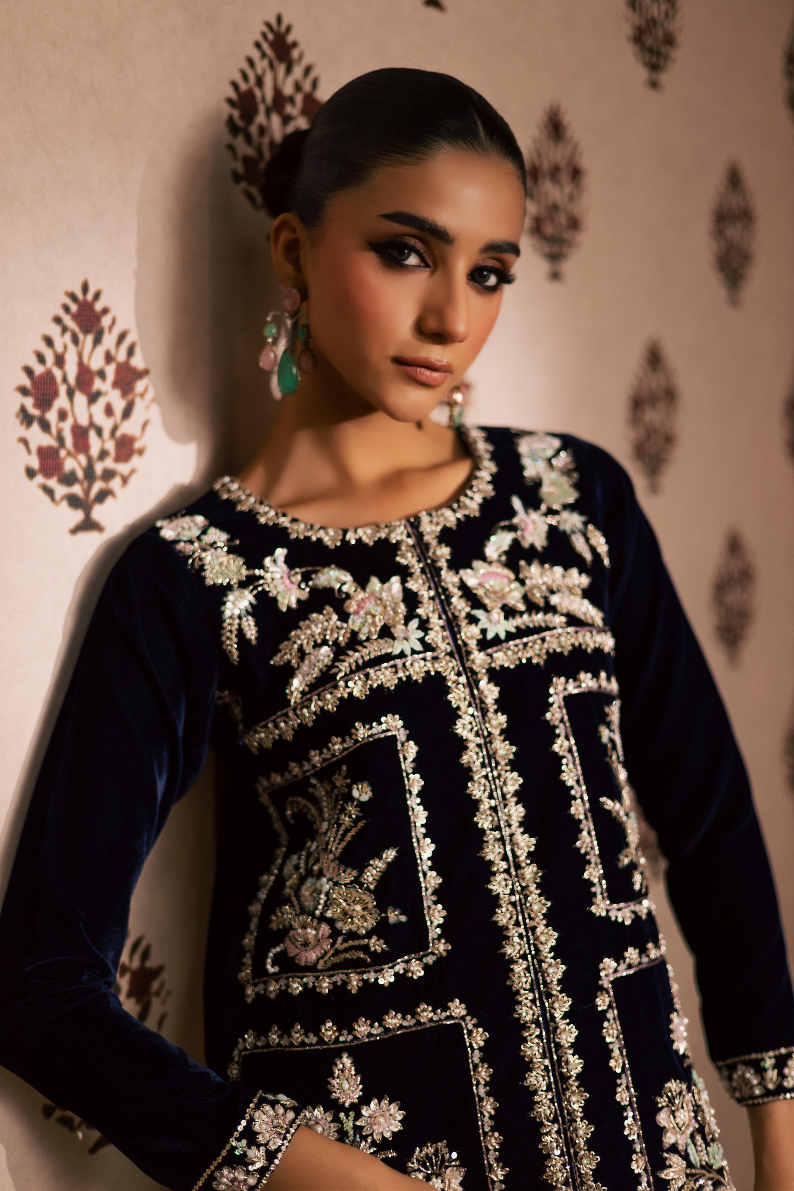 A velvet jacket, fully embellished with kora, dabka, sequins, crystals, threadwork, and pearls on front, back, and sleeves. Paired with... Read more