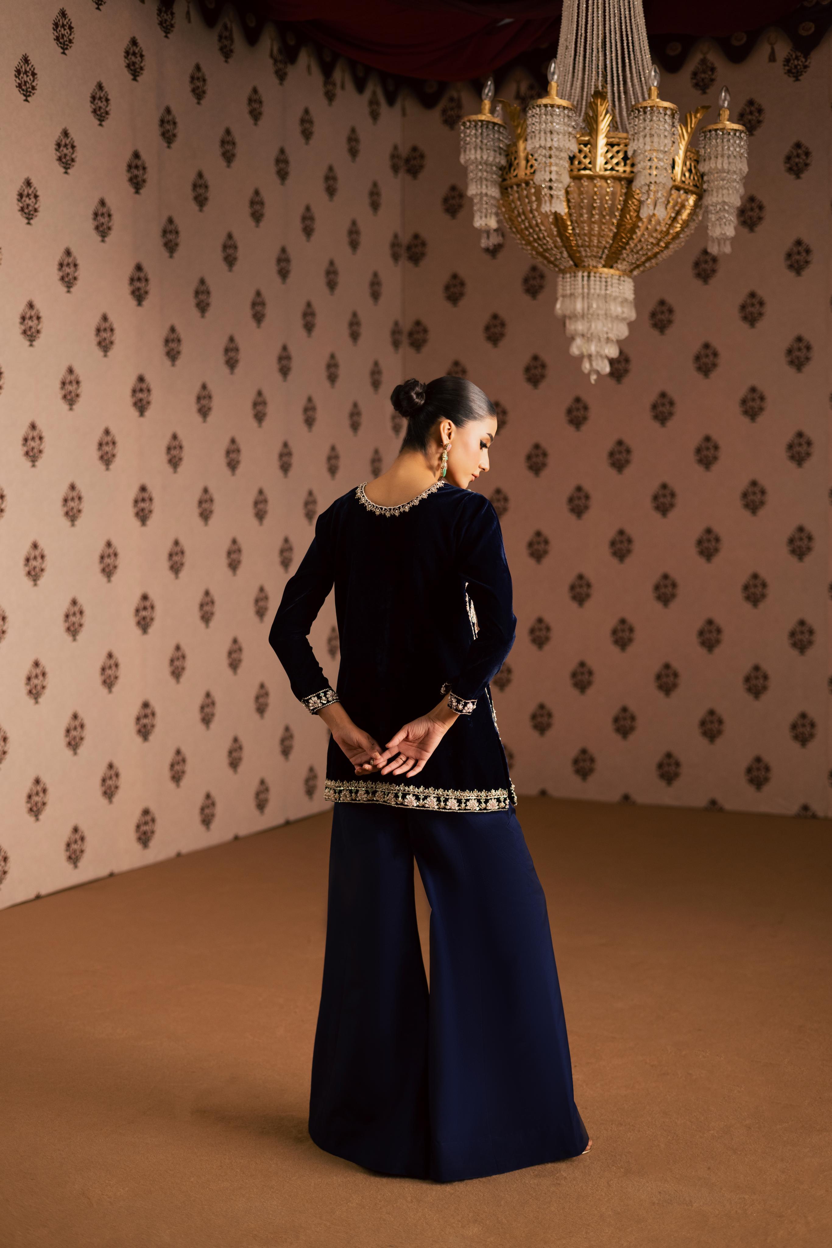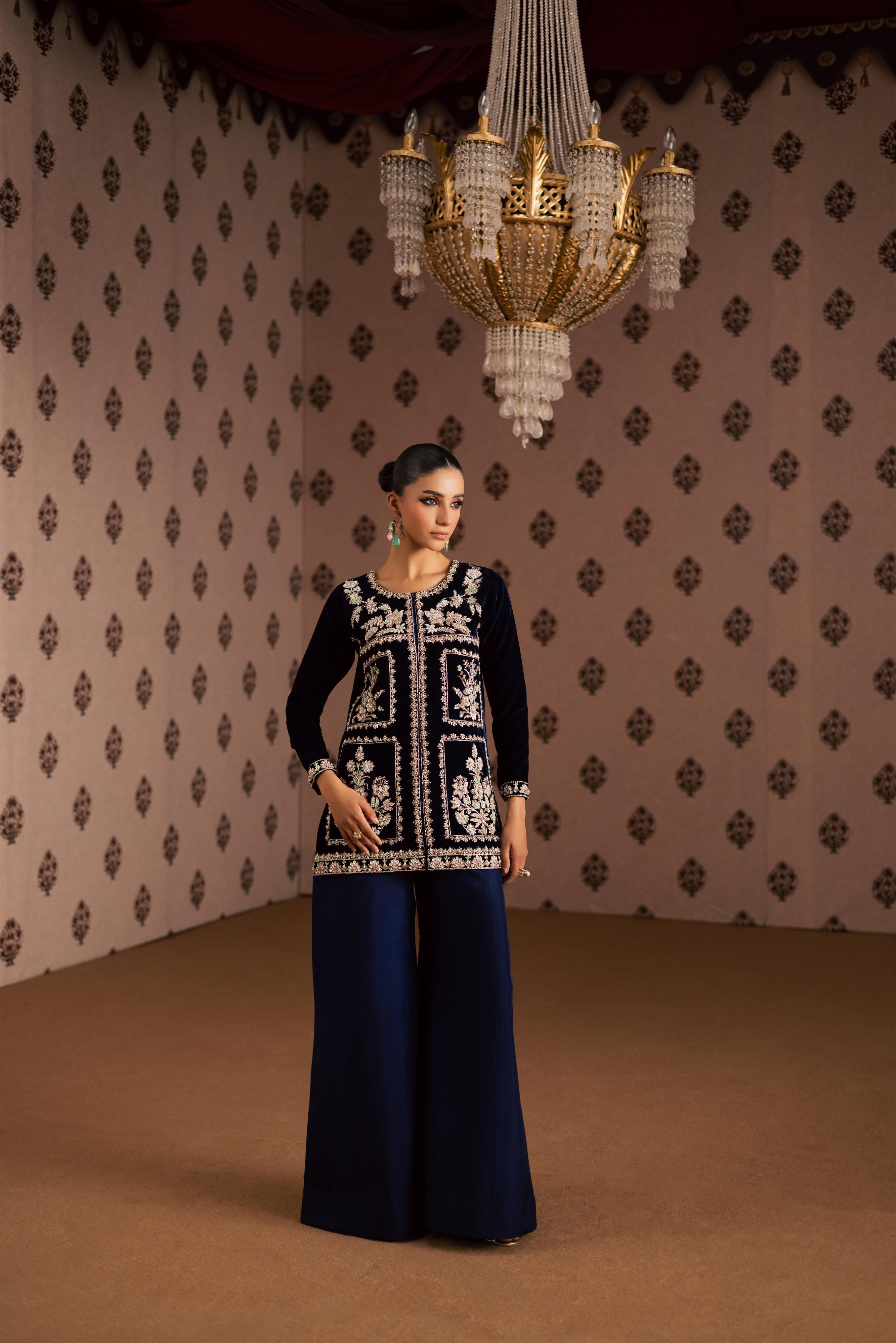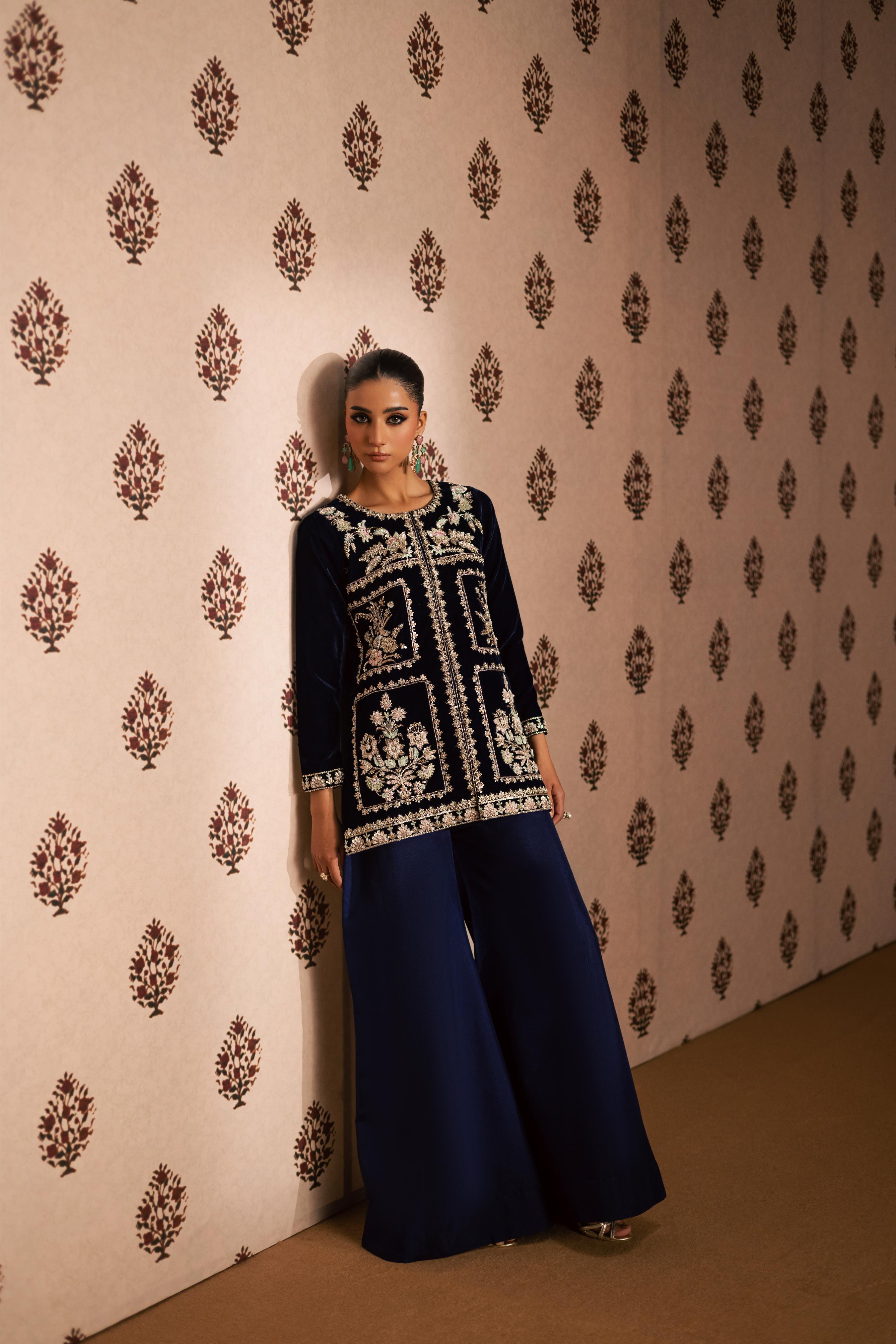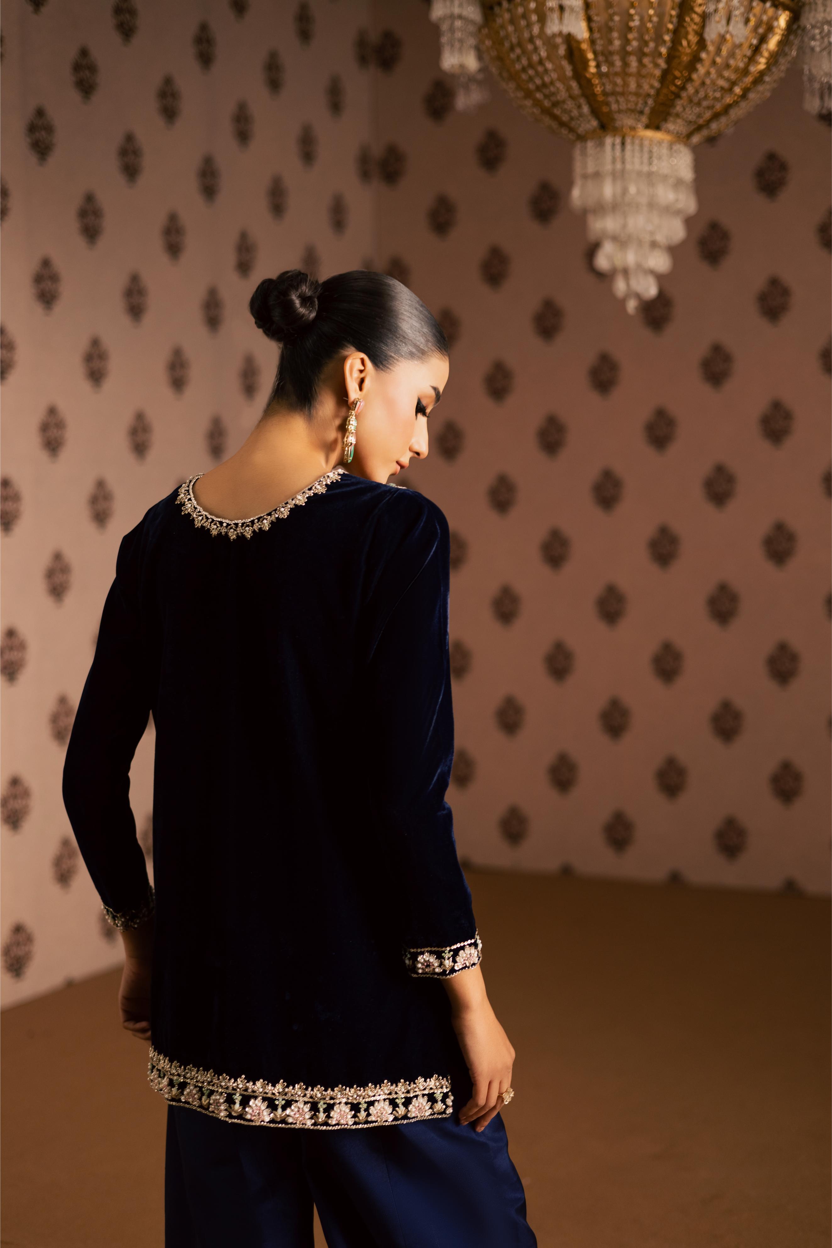 A velvet jacket, fully embellished with kora, dabka, sequins, crystals, threadwork, and pearls on front, back, and sleeves. Paired with... Read more